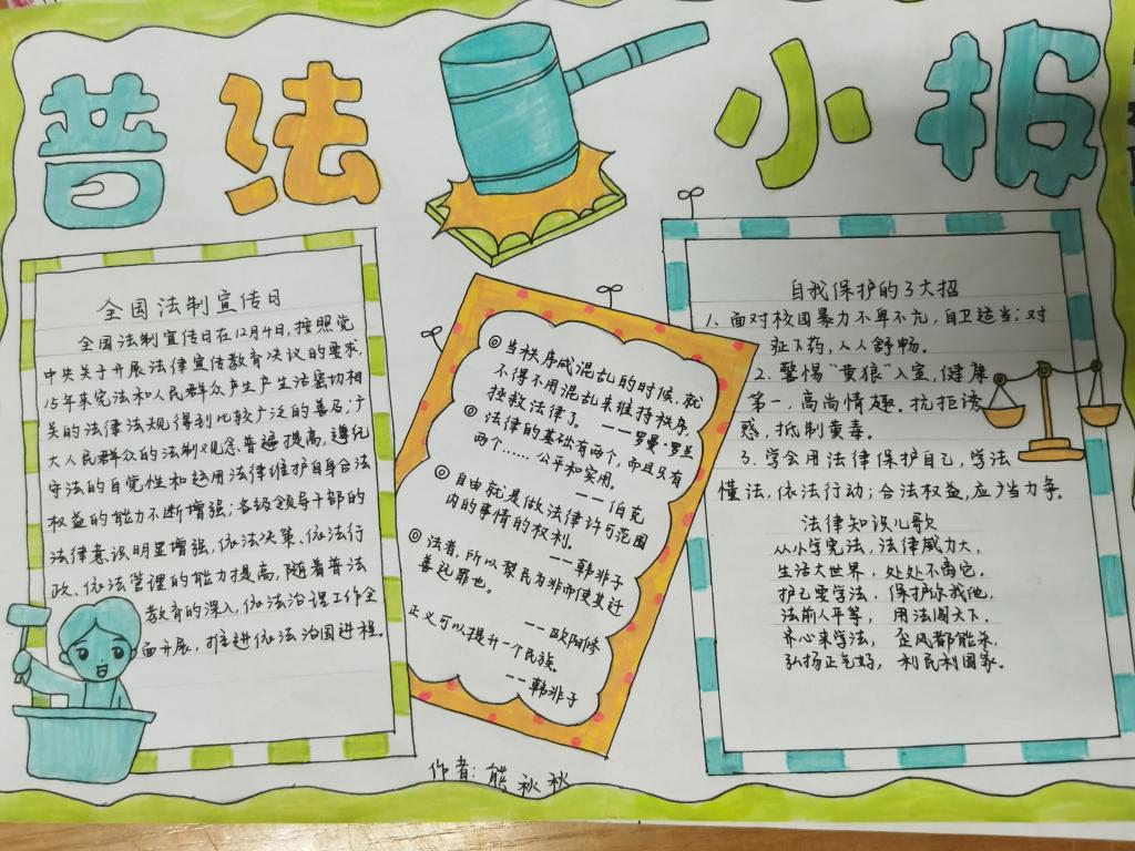 从参赛的作品中,看到了同学们对本次手抄报的重视,他们通过一笔一勒的勾画,诠释了自己心中法律的重要性,充分体现了同学们心中浓厚的法制观念和守法美德。最后,学生会通过投票的方法,坚持公平公正的原则,选出了本次普法手抄报活动大赛的一等奖一名:闫露冰,二等奖三名:熊秋秋,程昭雅,阮莹莹,三等奖五名:孙柯,宋璐瑶,管醒,杨钰,吴涵。