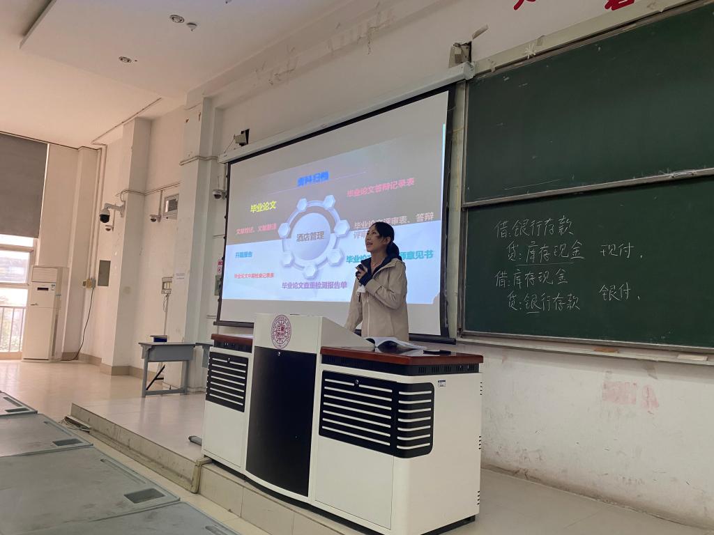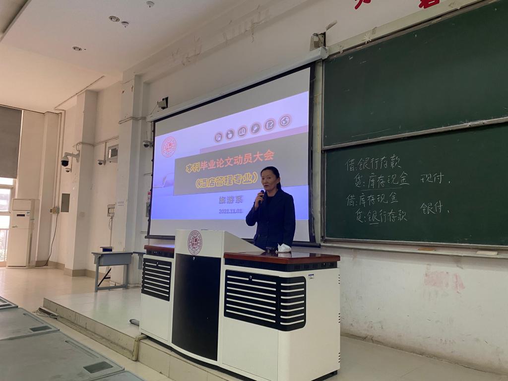 2021年11月1日下午14:00,beat365官网旅游系在三阶二教室召开酒店管理本科毕业论文动员大会。2018级酒店管理1、2、3班、2020级酒店管理专升本1、2班全体同学到场参加了会议,旅游系全体实习论文指导老师列席了会议。