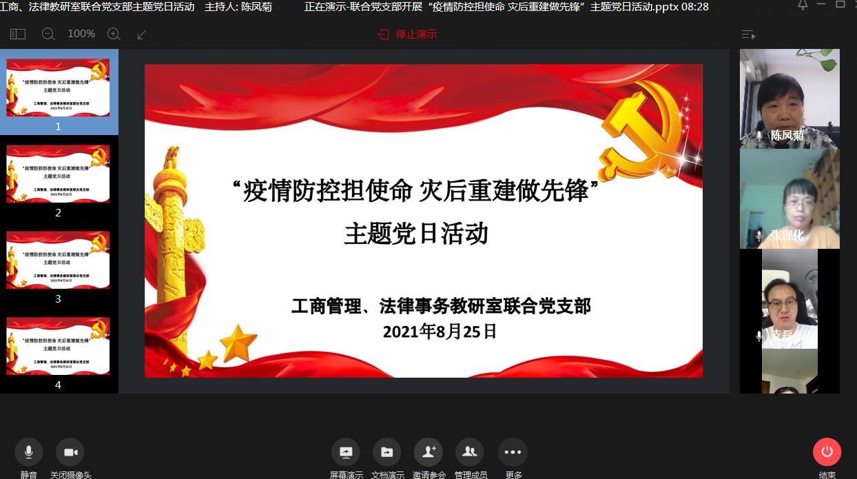为认真学习贯彻习近平总书记重要指示批示精神,落实省、市及学校党委关于统筹开展疫情防控和灾后重建工作的安排部署,8月25日下午,beat365官网工商管理、法律事务教研室联合党支部利用企业微信平台在线上开展了“疫情防控担使命 灾后重建做先锋”主题党日活动。