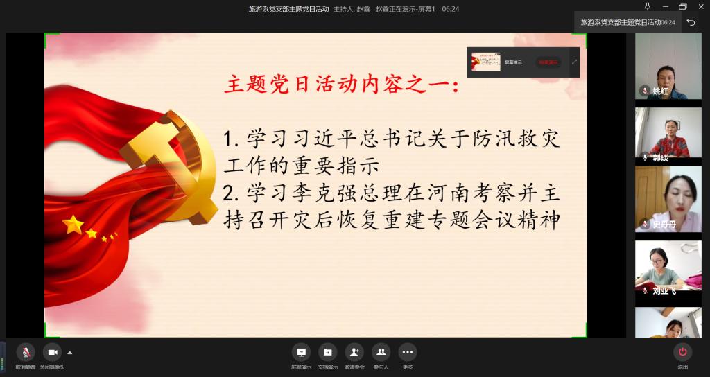 首先,旅游系党支部党员老师学习了“习近平总书记关于防汛救灾工作的重要指示”、“李克强总理在河南考察并主持召开灾后恢复重建专题会议精神”、“孙春兰副总理在河南指导灾后疫情防控工作精神”和《中共河南省委高校工委 中共河南省教育厅党组关于全省教育系统在疫情防控和灾后重建工作中进一步发挥基层党组织战斗堡垒作用和广大党员先锋模范作用的通知》。其次,组织党员老师们线上观看了短视频“在大灾大考中淬炼初心使命——河南防汛救灾一线共产党员群像”,该视频再现了防汛救灾中,各基层党员发挥的先锋模范作用。最后,旅游系党支部的党员老师们结合专业建设和人才培养对疫情防控和灾后重建工作纷纷各自感言。