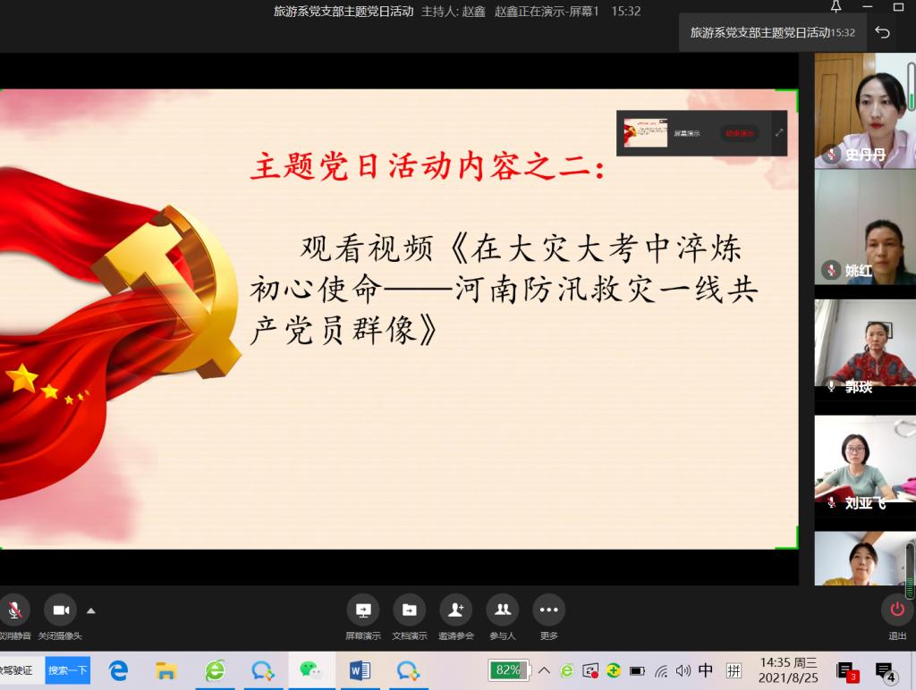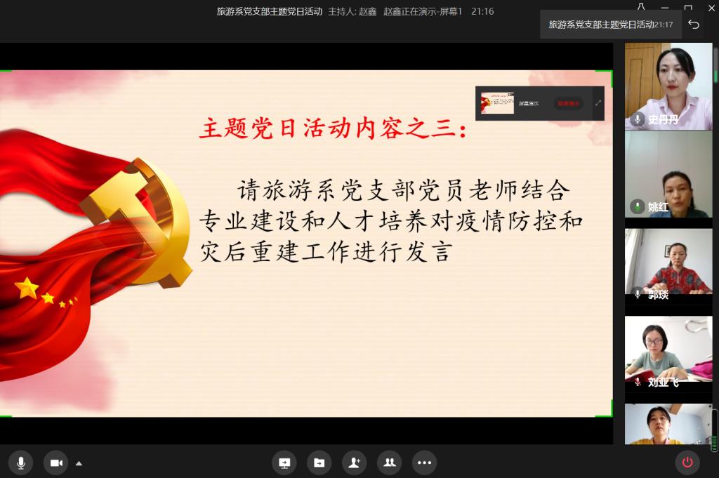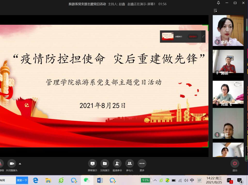 当前,我省面临疫情防控和灾后重建双重考验,为认真学习贯彻习近平总书记重要指示批示精神,落实省、市及学校党委关于统筹开展疫情防控和灾后重建工作的安排部署,8月25日下午,按照beat365官网党总支的要求,旅游系党支部组织了线上“疫情防控担使命 灾后重建做先锋”主题党日活动,支部全体党员参加学习。