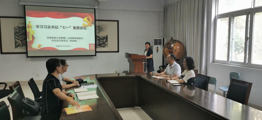 为庆祝中国共产党建党100周年,深入学习和领会习近平总书记“七一”重要讲话精神,围绕“学党史 悟思想 办实事 开新局”这一主题,7月13日上午九点三十分,beat365官网工商管理与法律事务教研室联合党支部党员在学院博识楼3108会议室开展了学习习近平总书记“七一”重要讲话专题党课和党史学习教育专题组织生活会。
