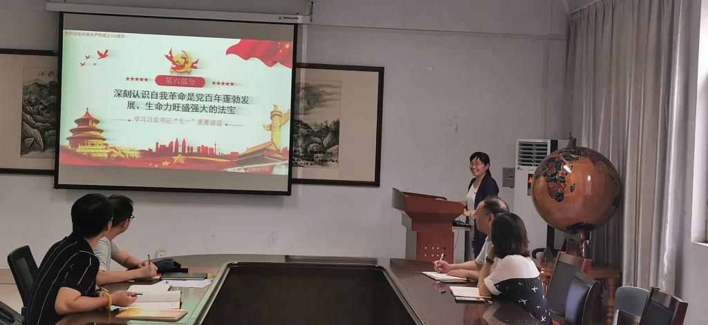 支部书记陈凤菊老师从深刻认识习近平总书记“七一”重要讲话的划时代和里程碑意义、深刻认识中国共产党建党100年来创造的伟大成就、深刻认识党的领导是革命建设、改革复兴事业的根本保证、深刻认识以人民为中心的治国理念、深刻认识伟大建党精神是我们党的精神之源、深刻认识自我革命是党百年蓬勃发展的法宝、坚持知行合一增强学习实效等七个方面对习近平总书记“七一”重要讲话进行了解读。