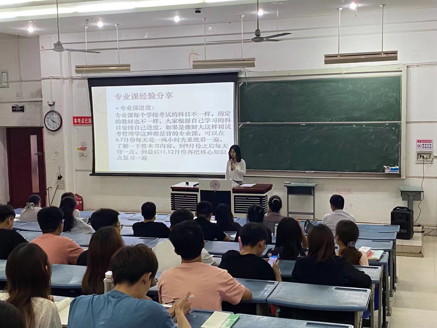 郭桃、徐英翔两名同学作为考研成功的学生代表也先后上台发言,他们就考研准备、目标定位、考研复习、面试策略等方面进行了经验总结。