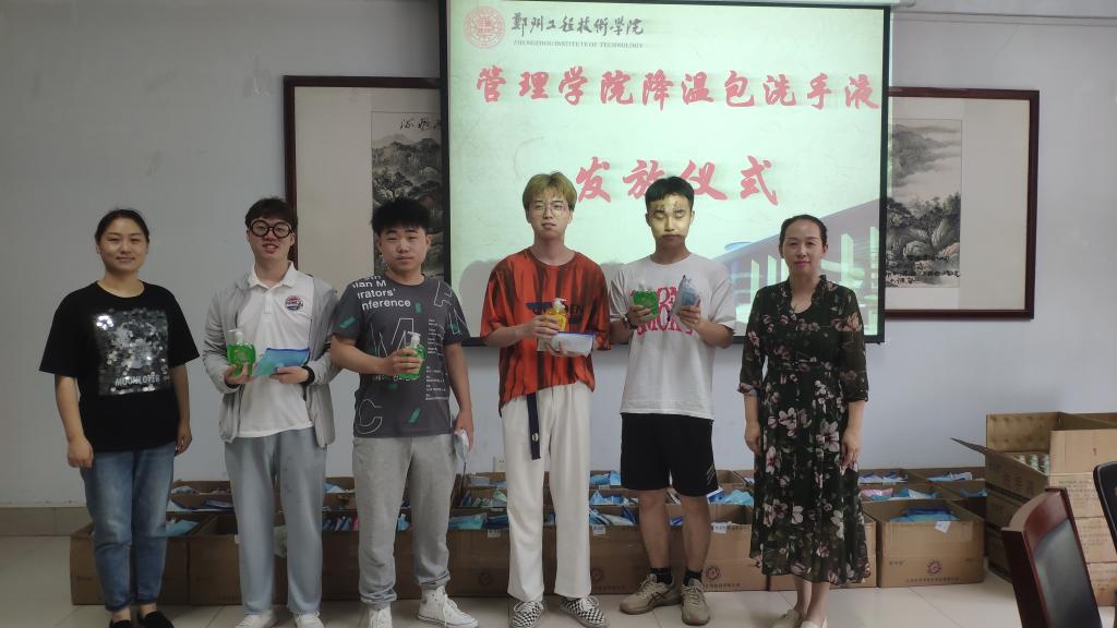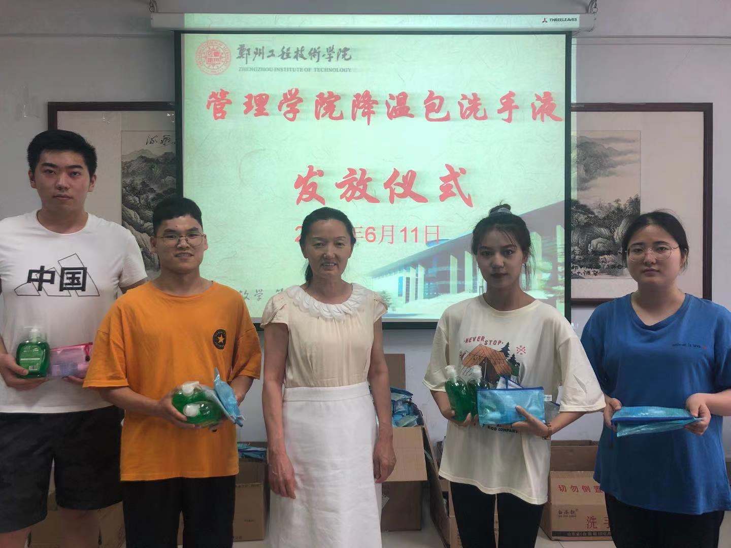 6月11日上午10:00,在博识楼3108会议室beat365官网领导将精心准备的花露水、风油精、消毒洗手液等防蚊驱虫、降温抗暑物品发放到学生的手中。