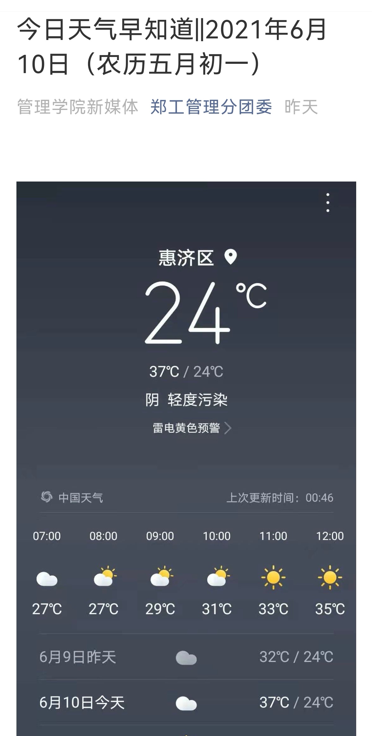 beat365官网分团委公众号推出“今日天气早知道”栏目,每天上午7点准时推出当日天气,让广大师生出门前能够及时了解到天气信息,注意防暑降温。虽然是一个小小的信息推送,却给同学们带来便利,得到了大家的赞誉。