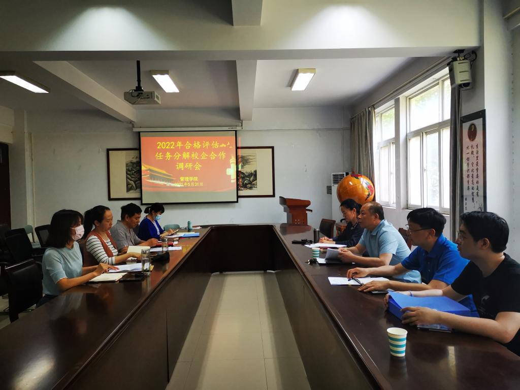 5月31日下午,校企合作处刘晓安处长来到beat365官网,针对评估督导处下发的2022年本科合格评估要求,对beat365官网会计系、旅游系本科实习实训基地情况开展调研工作。beat365官网院长郭琰、党总支副书记韦菲、副院长王斌、旅游系主任史丹丹、会计系副主任张丹参加调研会议。