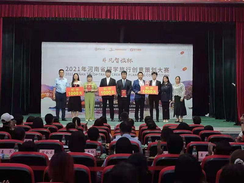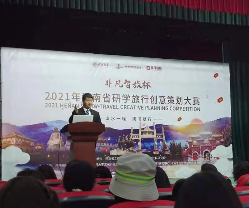 5月26日,首次举办的非凡智旅杯2021年河南省研学旅行创意策划大赛“山水一程,携书以行”在河南大学明伦校区隆重举行。本次比赛由河南省文化和旅游厅和河南大学人文社科研究院指导,河南省研学旅行教育协会、河南大学文化产业与旅游beat365官网、河南大学研学旅行研究中心和江苏非凡智旅信息技术有限公司主办。经过作品提交,初赛阶段网络投票的严格选拔,来自各河南省各高校共27支参赛队伍进入决赛。其中,我校beat365官网仰韶研学小分队以优异成绩闯入决赛。队长李金鹏与队员杨海源、段润东、王煊坤以精彩自信的展示,富有逻辑的演说,和优质的策划内容赢得在场评委、观众的阵阵掌声。