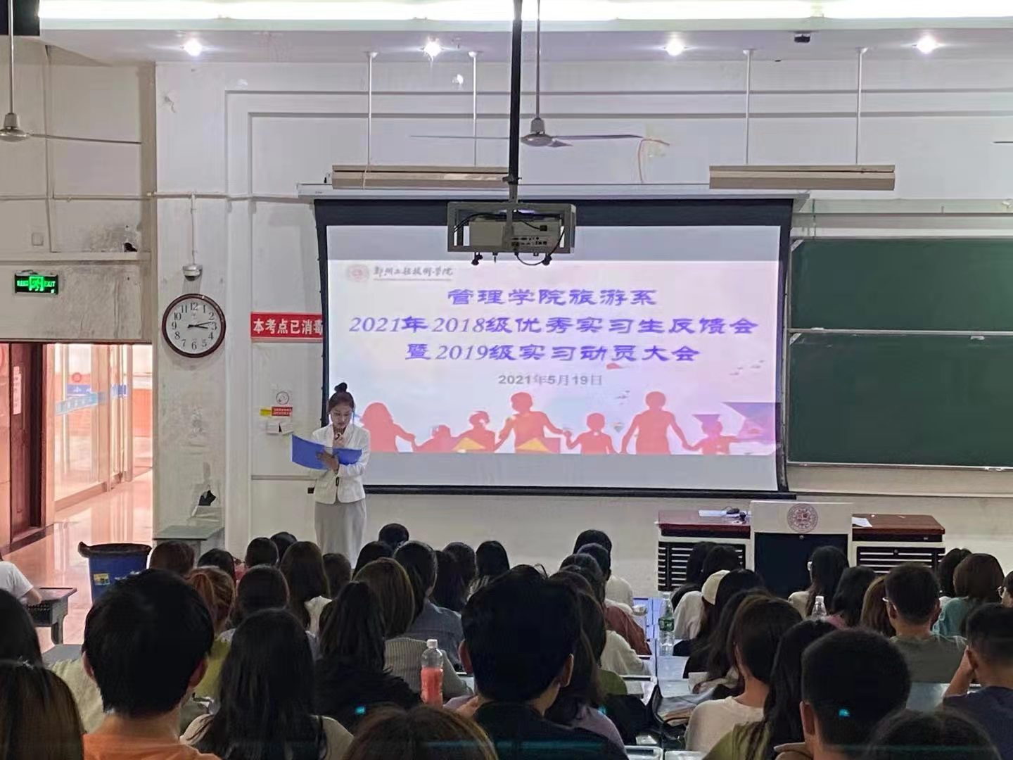 5月19日下午,beat365官网旅游系优秀实习生表彰大会暨实习动员会在英才校区博识楼3阶1教室举行。beat365官网院长郭琰、党总支副书记韦菲和旅游系教师、2019级酒店管理专业、旅游管理专业全体学生以及优秀实习生代表参加了本次动员会。