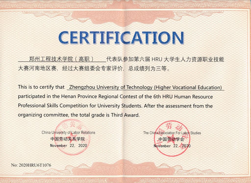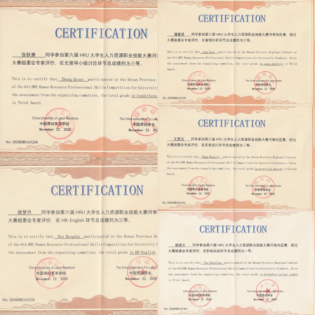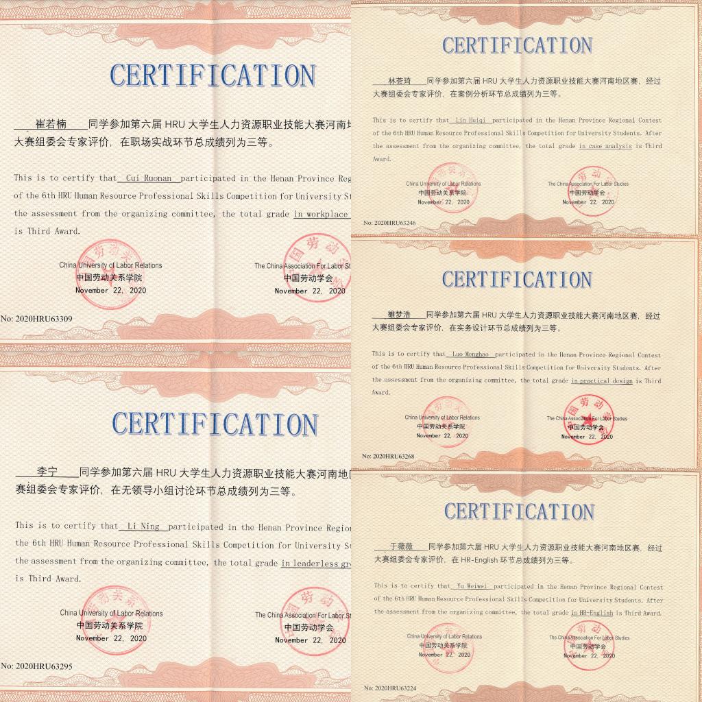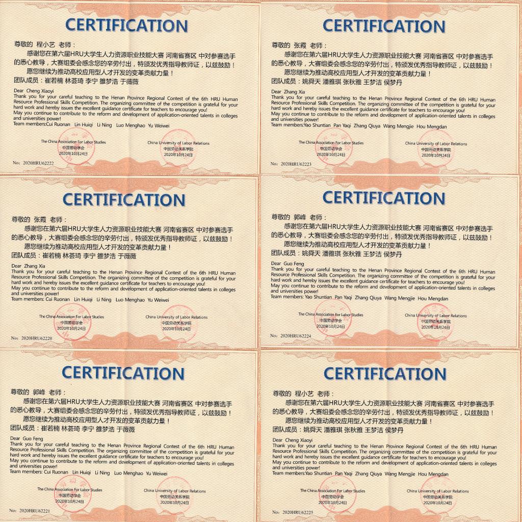 近日,由中国劳动学会、中国劳动关系学院主办的第六届HRU大学生人力资源职业技能大赛河南赛区比赛正式结束。比赛共有来自河南省内郑州大学、河南财经政法大学、河南理工大学等20多所高校110余名选手参赛。我校由张霞、郭峰和程小艺老师任指导教师,beat365官网2018级人力资源管理专业崔若楠、林荟琦、雒梦浩等10名同学组成的2支代表队,最终获得本科组团体三等奖1项,专科组团体三等奖1项,学生组个人单项一等奖1项、二等奖1项、三等奖8项。张霞、郭峰、程小艺获优秀指导教师称号。