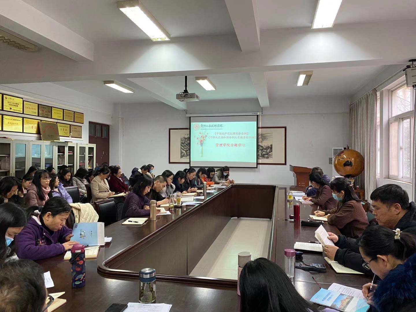 最后,学院党总支纪检委员郭松涛带领全体教师学习《中国共产党纪律处分条例》和《中华人民共和国公职人员政务处分法》,会议强调全体教师应牢记公职人员身份,按照法律法规要求履职尽责。