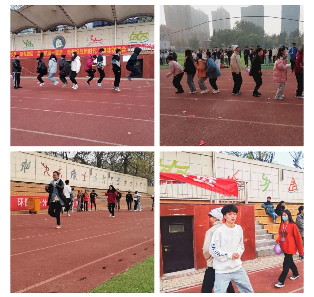 第二项的趣味运动比拼环节,包括“珠行万里”、“十人跳大绳”、“齐心协力向前冲”三个运动项目。参赛的有航海校区2020级旅游管理和会计两个专业4个班级的代表队以及英才校区的4个代表队。相对于第一项的表演环节,似乎趣味运动的现场气氛更加热烈。参赛同学们或单人或团队合作尽力完成自己的任务,全身心的投入在比赛中。赛场上同学们不时发出欢快的笑语声、激动的欢呼声、热烈的鼓掌声,将青春的光芒发挥到极致。