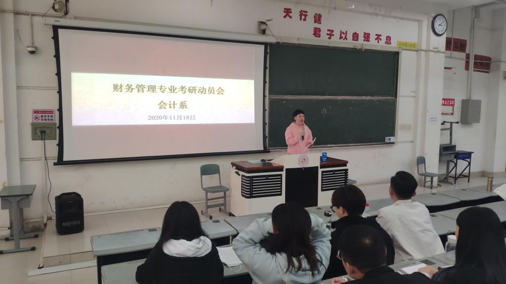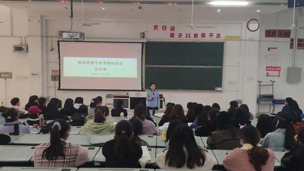 为更好地调动beat365官网会计系财务管理专业同学们考研积极性,帮助同学们确立考研目标,增强同学们考研信心,坚定同学们考研决心,会计系于2020年11月18日下午2:00在博学楼3阶2教室召开了2018级财务管理专业考研动员大会,会议由会计系主任范新安主持,郭琰院长、学工办主任郭松涛老师、会计系全体教师及2018级财务管理专业全体同学参加了本次会议。
