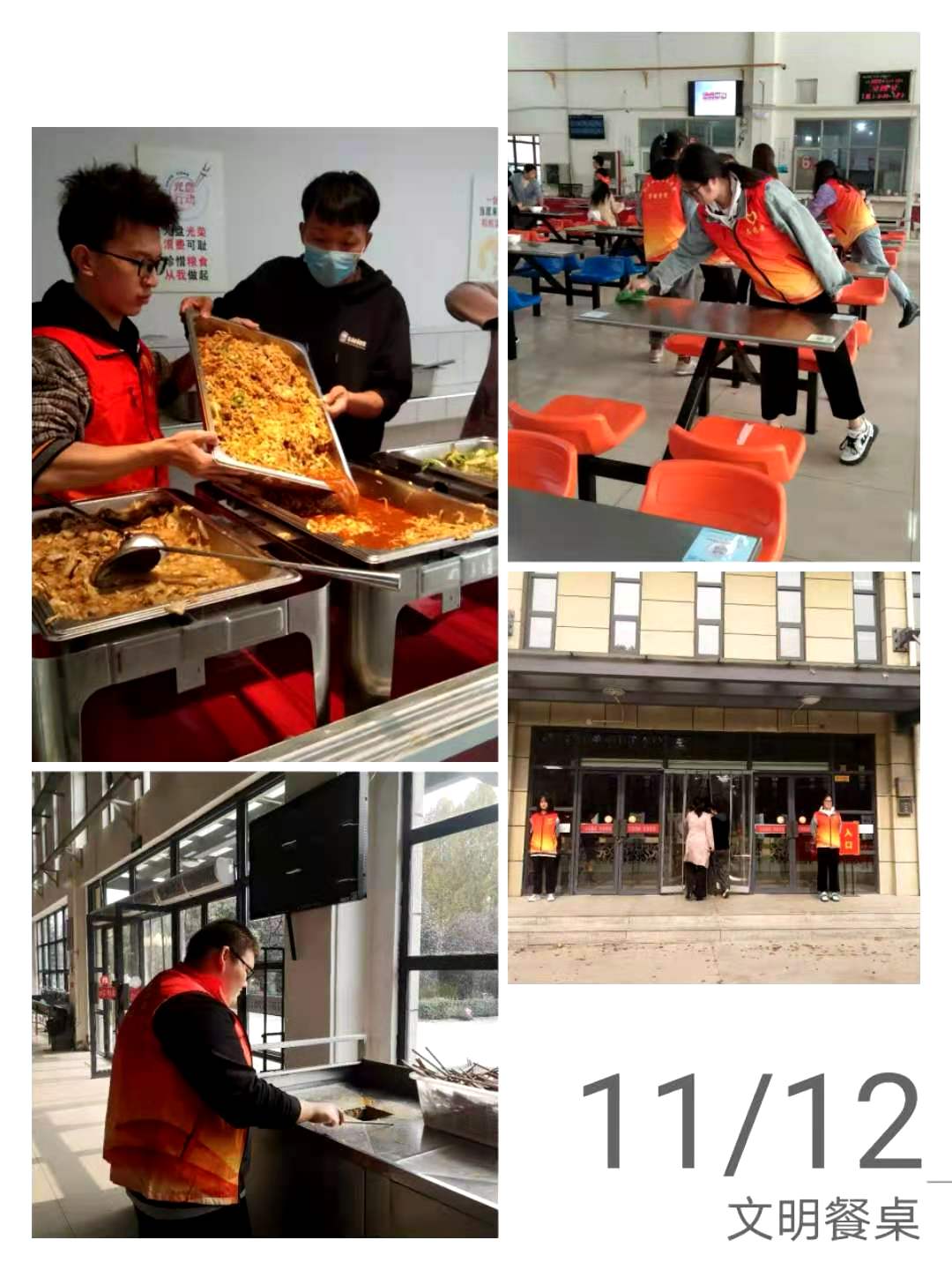 11月12日12:00,身穿志愿者服装同学们在润泽园餐厅前集合完毕,在餐厅负责人的安排下,协助工作人员维持就餐秩序、宣传文明就餐理念,提醒就餐的师生们离开时把废纸等垃圾随手扔进垃圾箱,保持餐桌的干净整洁,营造一个干净卫生的用餐环境。在用餐高峰期,志愿者们主动组织和引导师生们排队打饭,不插队、不拥挤、不混乱,并及时将就餐时落下的垃圾清理干净。