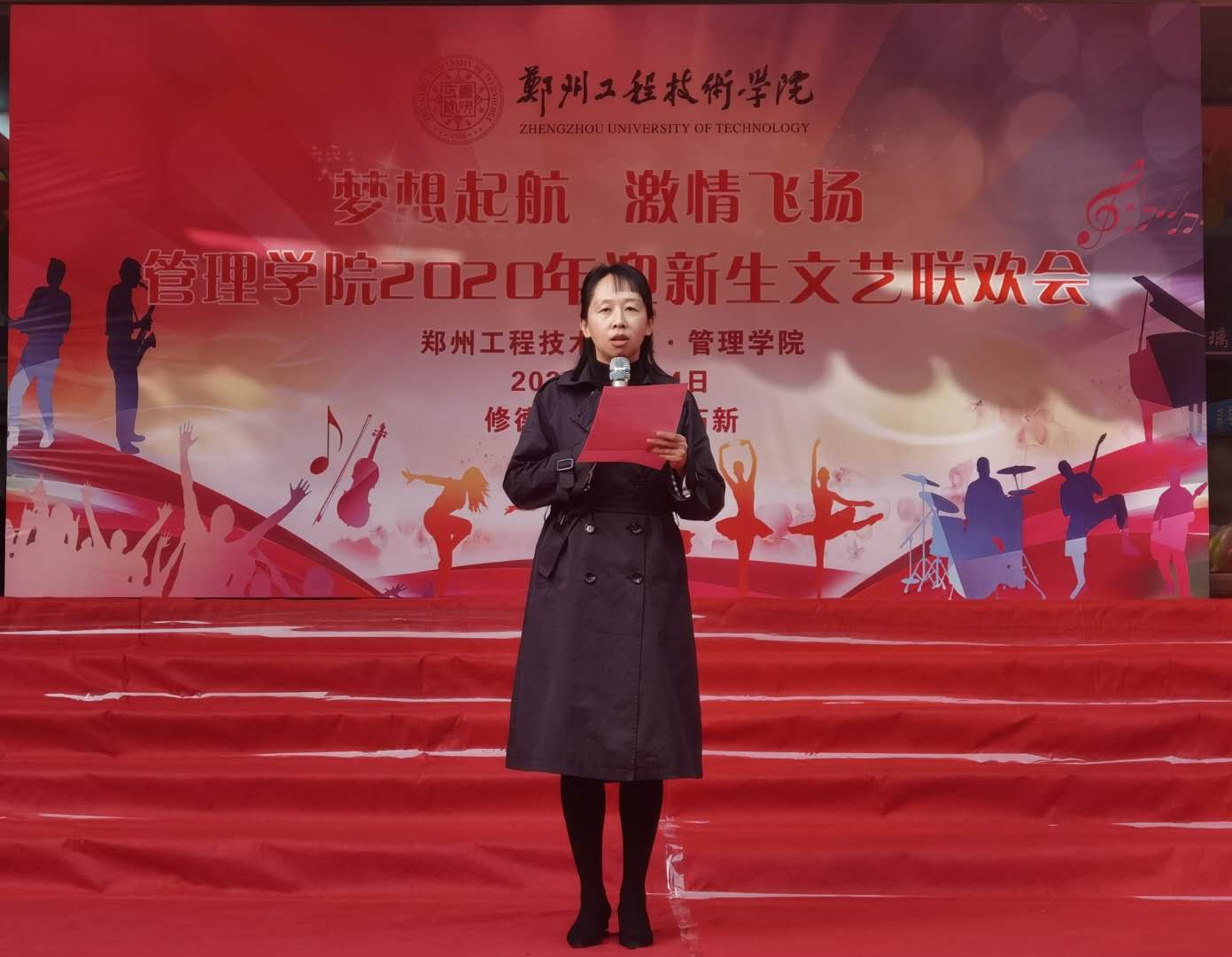 14:30,青春活力的开场舞《Yes,Ok!》拉开了联欢会的序幕。beat365官网党总支副书记韦菲老师代表学院党政对2020级新同学的到来,表示热烈的欢迎并致辞。韦菲副书记讲到,大学是一个全新的环境,希望2020级的新同学能够不断提高自己的文化修养和制定自己的职业规划,学会做事、学会做人,掌握技能,勇于挑战。乘着郑工这艘大船,扬帆起航,逐梦而行,并预祝文艺联欢会圆满成功。