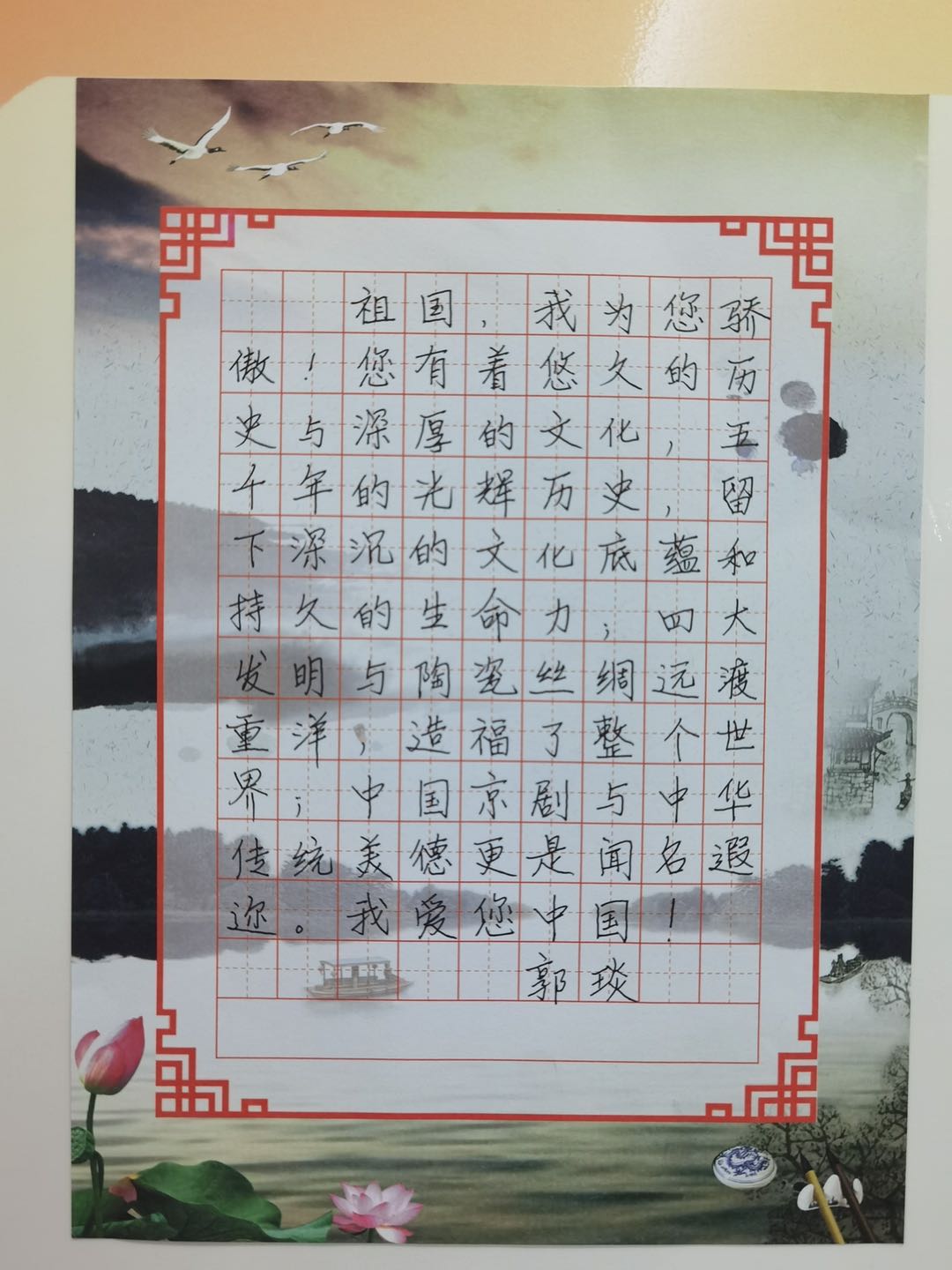郭琰院长说:“祖国,我为你骄傲!您有着悠久的历史和深厚的文化,五千年的光辉历史, 留下深沉的文化底蕴和持久的生命力,四大发明与陶瓷丝绸远渡重洋,造福了整个世界,中国京剧与中华传统美德更是闻名遐迩。我爱您中国”!