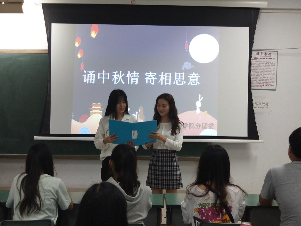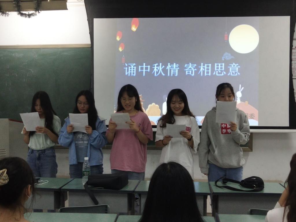 中秋节是中华民族最具代表性和广泛性的一个重要传统节日,它展现出中华民族注重亲情、乡情、友情的优良品德,表露着思亲盼团圆、中华一家亲的和美情愫。分团委和各班团支部,以不同的形式开展活动。活动内容有讲中秋来源,分享中秋节传统习俗,诵读具有代表性的经典诗作等。诵读活动既有充满意境的古诗佳作,也有抒发胸怀的现代诗歌和散文,使得诵读内容更加丰富。从“露从今夜白,月是故乡明”到“秋空明月悬,光彩露沾湿”等,每句诗都寄托着缕缕思乡愁绪。表演形式新颖有趣、形式多样,既有激情飞扬的吟唱,也有清淡儒雅的低诵,同学们通过配乐朗诵、古诗串联等形式,将一首首优秀的经典诗文展示出来。在表达同学们对祖国文化无限热爱的同时,也创造性地诠释了经典诗文。