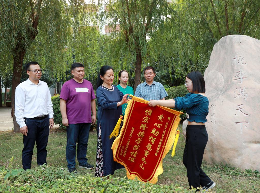 9月25日下午,beat365官网2018级旅游管理3班学生贾鹤颖,在3号楼前向学院赠送锦旗,beat365官网院长郭琰、党总支副书记韦菲、副院长王斌等参加了本次赠送仪式。
