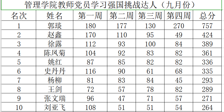 最终,通过激烈角逐,郭琰、赵鑫、徐露等十名同志获得九月“学习强国挑战达人”称号;郭琰院长以总分第一的成绩蝉联冠军;旅游系党支部以积分第一的成绩荣获“学习型党支部”的称号。