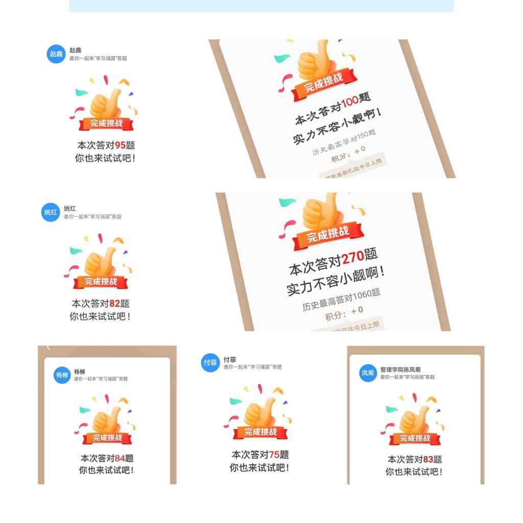 本月挑战赛为期四周,坚持“全覆盖、共参与、同进步”的原则,依托学院各支部开展答题挑战赛,挑战时间限定于每周三的12:00-19:00,比赛仍采取线上答题形式,每位党员在规定时段内登陆“学习强国”APP“挑战答题”系统作答,挑战次数不限,以答题多者、用时短者为胜。比赛中,党员教师们沉着应对、快速思考、熟练答题、分秒必争,展现出党员教师扎实的学习成效和良好的精神风貌。
