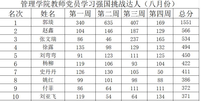 为激发beat365官网教师对理论知识的学习热情,推动“不忘初心、牢记使命”主题教育往深里走、往实里走、往心里走,beat365官网“学习强国答题挑战赛”的热度不减,本月,郭琰、赵鑫、张文瑞等十名同志获得八月“学习强国挑战达人”称号,郭院长以总分第一的成绩蝉联冠军。旅游管理系党支部以积分第一的成绩荣获“学习型党支部”的称号。