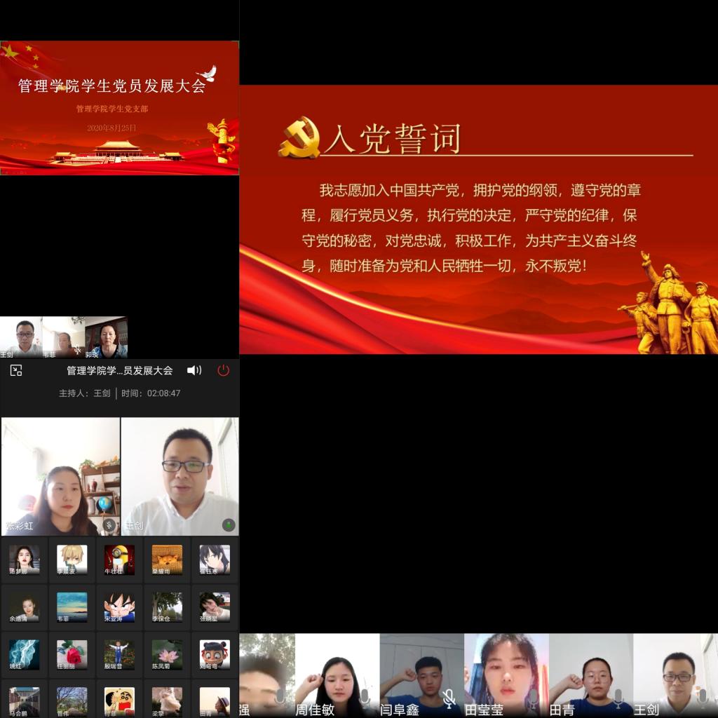 会议第一项,由发展对象逐一进行入党志愿书的宣读以及介绍自己的入党动机。申请入党的同学们都真情的表达了对党的向往,对党的忠诚,表示坚定不移跟党走,为党的工作付出自己的力量,为共产主义事业奋斗终生。表明了入党动机和他们要加入中国共产党的强烈愿望。第二项,每位发展对象的入党介绍人也对其进行了关于学习、工作、实践活动等方面的综合评价。第三项,与会的党员同志对23名发展对象,自培养期以来的表现进行讨论。第四项,与会有表决权的正式党员对接收预备党员进行无记名投票表决,最终全体与会正式党员一致同意陈宁等23名发展对象正式成为预备党员。会议第五项,由学生党支部组织委员田青老师带领新发展预备党员进行入党宣誓,他们高亢激昂的声音通过网络视频久久回荡,真正展现出了对党的崇高敬意。