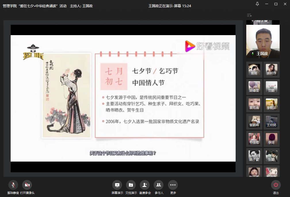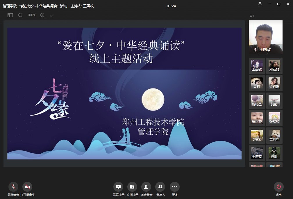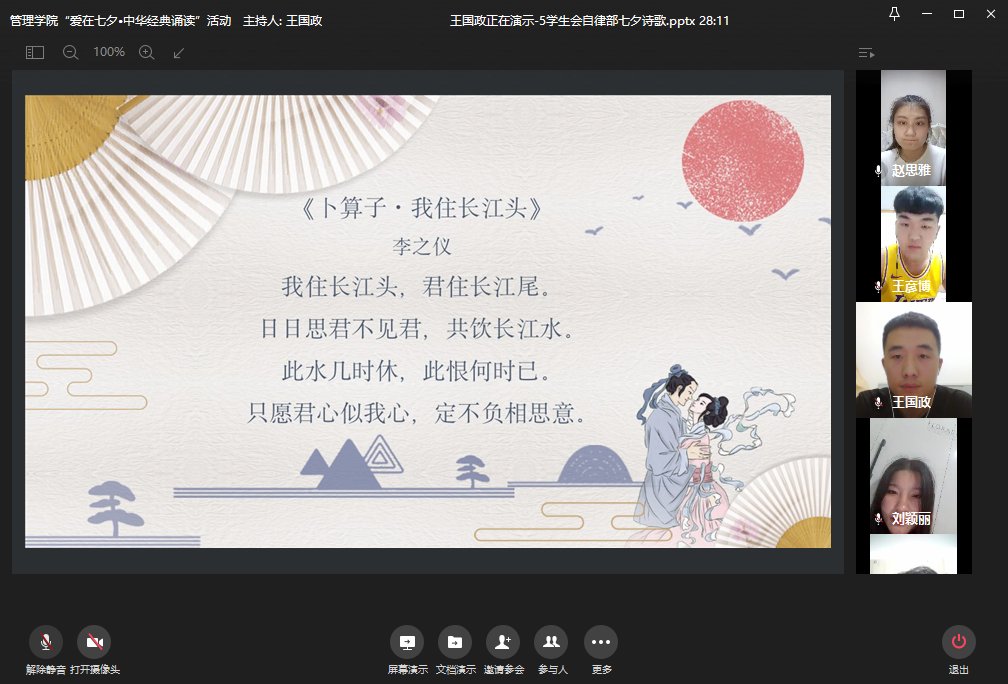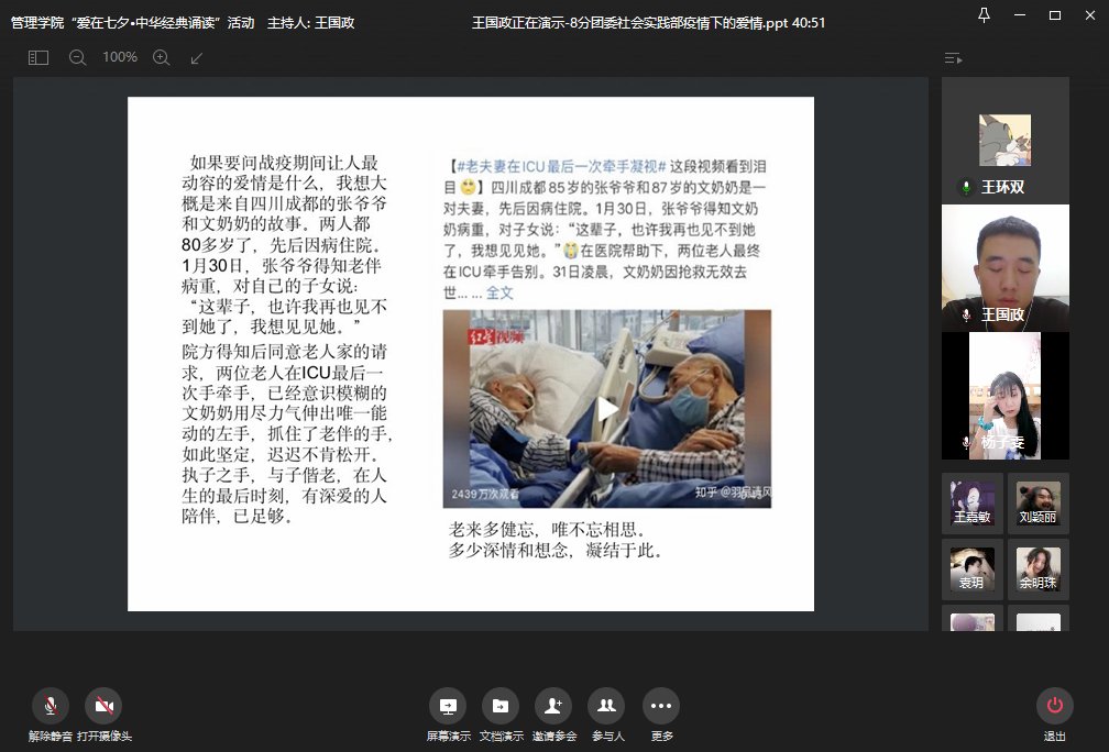 活动主要分为:了解“七夕”由来及背景、观看视频了解关于“七夕”节的故事、分享古时七夕佳节民俗、诵读经典爱情诗篇和分享疫情期间感人的爱情故事五个环节:首先由分团委组织部的同学给大家讲解了“七夕”由来及背景;第二项由分团委宣传部的同学分享了在网上搜集的关于七夕的介绍视频,让大家更好的了解了七夕有关的故事内容;第三项,学生会体育部的同学分享古时七夕佳节民俗活动,如:“猜灯谜”、“七夕乞巧大赛”等古代游戏,大家仿佛看到了古时候人们在七夕节时的热闹场景;第四个环节,学生会文艺部、自律部、事务部的同学们分享诵读了一些经典爱情诗篇;最后学生会宣传部以及分团委社会实践部的同学们分享了疫情期间医生和护士之间的感人爱情故事。