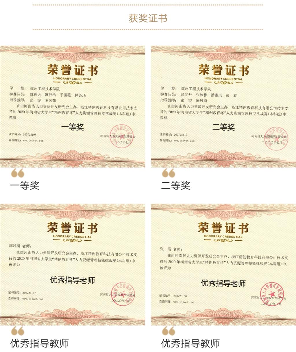 2020年7月25日,在张霞和陈凤菊两位指导老师的带领下,beat365官网人力资源管理专业学生派出两个参赛队伍,参加2020河南省大学生“精创教育杯”人力资源管理技能挑战赛(线上),分别获得一等奖和二等奖的好成绩。张霞和陈凤菊获得优秀指导教师称号。