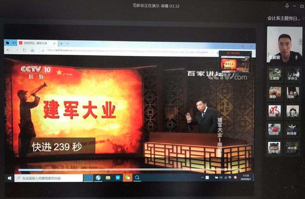 会计系党支部对此次活动高度重视,精心安排,通过企业微信视频会议开展了会计系党支部庆八一主题党日活动。会议分为三个环节。首先,会计系党支部书记范新安带领大家明确了学习要求,熟悉了学习来源和内容。第二,会计系支部全体党员同志共同观看了学习强国平台上人民军队创建历史专题讲座《建军大业》和《鉴往知来:跟着习主席学军史》。第三,讲述人民军队艰苦卓越的奋斗故事。最后,大家讨论交流学习心得。