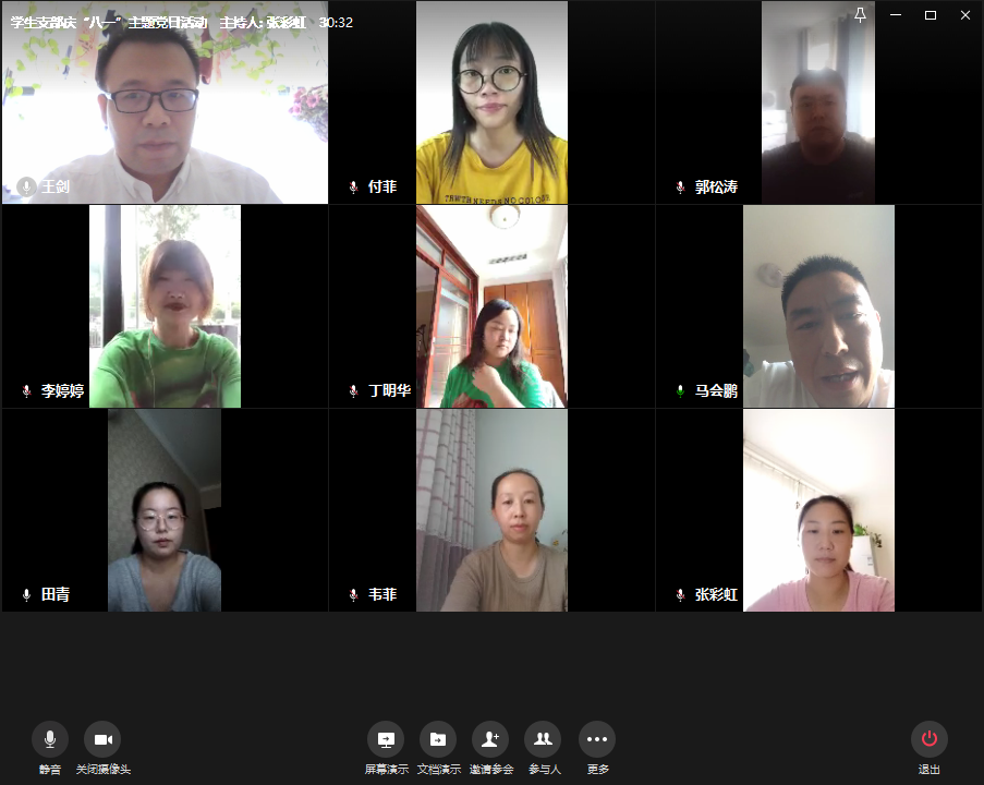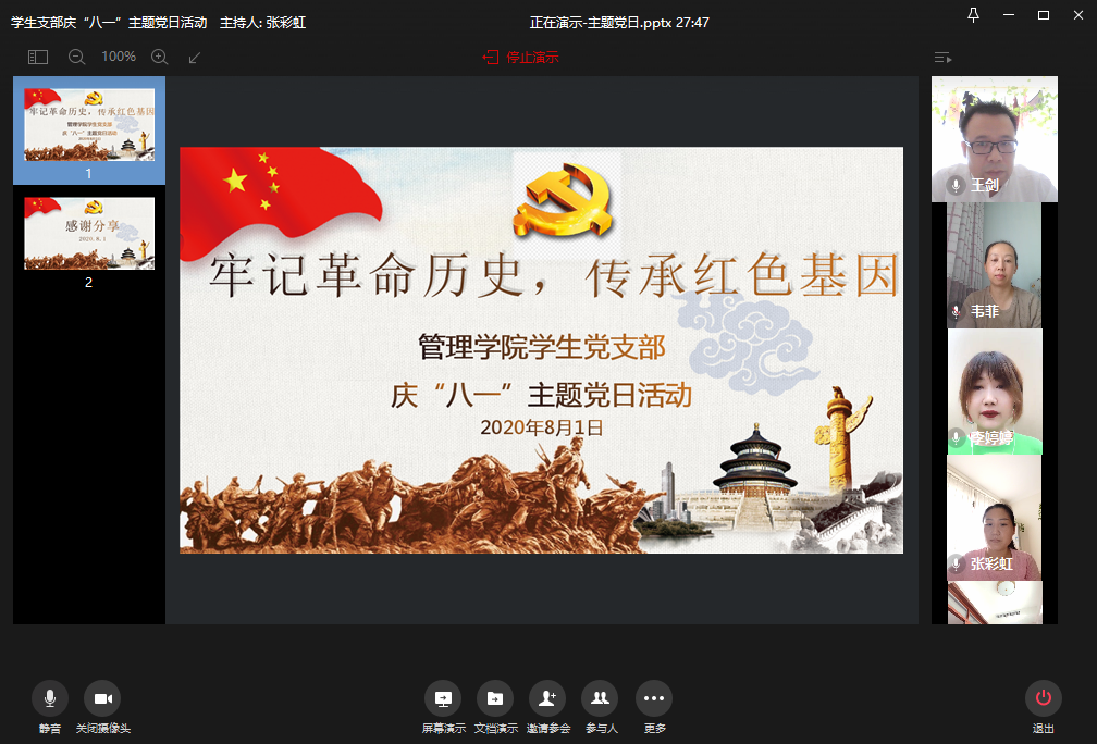 为热烈庆祝中国人民解放军建军93周年,引导广大党员深入学习习近平总书记参观四平战役纪念馆重要讲话精神,回顾党领导的人民军队用鲜血铸就革命成功的光辉岁月,根据beat365官网党总支关于开展主题党日活动的要求和活动方案,学生支部组织全体教工党员于8月1日下午在企业微信会议平台开展了“牢记革命历史,传承红色基因”主题党日活动。本次活动由学生支部副书记王剑主持。