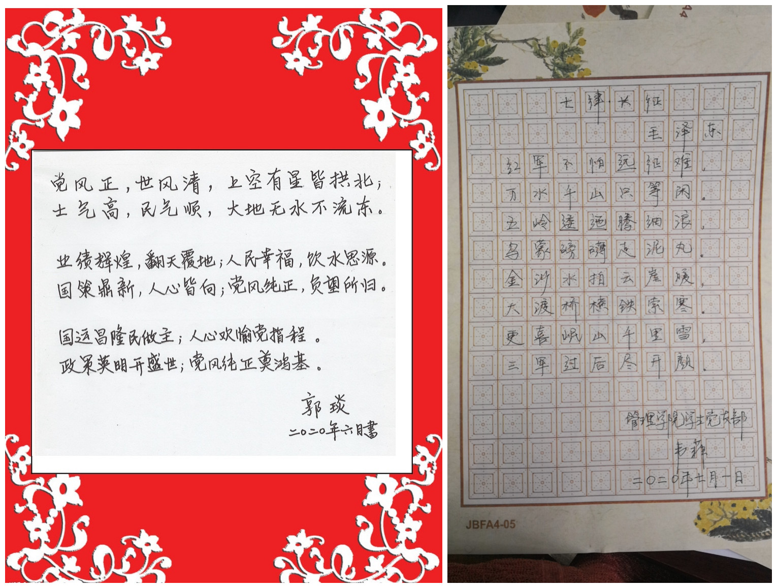 党总支在全体党员中开展庆“七一”书写红色经典活动。各支部分别以“书写红色经典,再现伟大历程”、“书写红色经典,抒发爱国情怀”、“书写红色经典,传承民族精神”为主题,组织广大党员书写下反映中国共产党领导的社会政治运动和普通人民生活的诗、词、歌、赋作品,以及反映习近平新时代中国特色社会主义思想的重要论述和报告内容节选。从毛泽东的《七律.长征》到《习近平谈治国理政》的重要论断,从闻一多的《祈祷》到入党誓词,大家所完成的作品题材丰富多样,笔迹各有千秋,但都饱含着对党的挚爱之情,表达了拳拳报国之志。