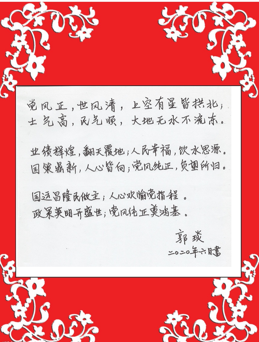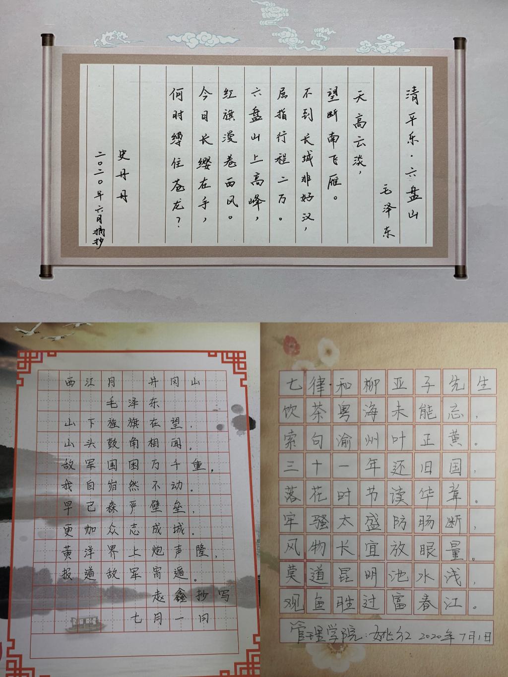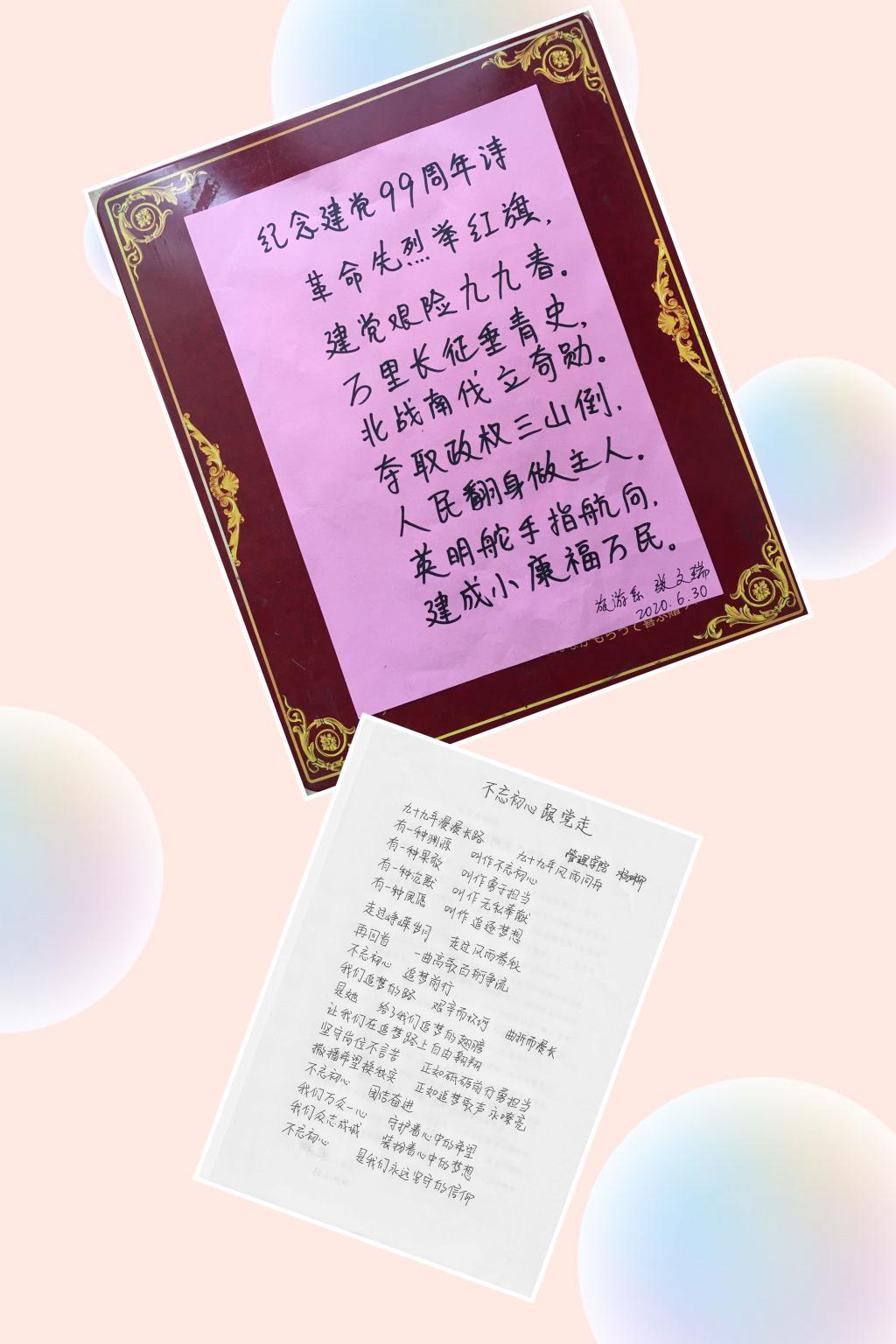 党员教师的书法作品均以红色经典诗词、习近平总书记经典用语等为主要内容,再现了党领导中国人民所走过的峥嵘岁月,抒发了对党和人民真挚的感情和深深的爱。其中郭琰院长的作品笔势俊美,气韵生动,作品内容充分展现了在党的领导下国富民强,百姓安居乐业的生动画面;张文瑞老师改编的纪念建党99周年诗,回顾了党的奋斗历程;杨柳老师的不忘初心跟党走,抒发了新一代年轻党员对党的深深的爱;刘亚飞老师重温入党誓词,让我们再次回望和肯定了我们的初心。其他老师的作品以毛主席诗词为题材,包括大家所熟知的《七律·长征》、《清平乐·六盘山》《西江月·井冈山》《七律·和柳亚子先生》等。老师们的作品或遒劲大气,或飘逸潇洒,或玲珑娟秀,充分展现了教师们扎实的书写功底和良好的教学素养。