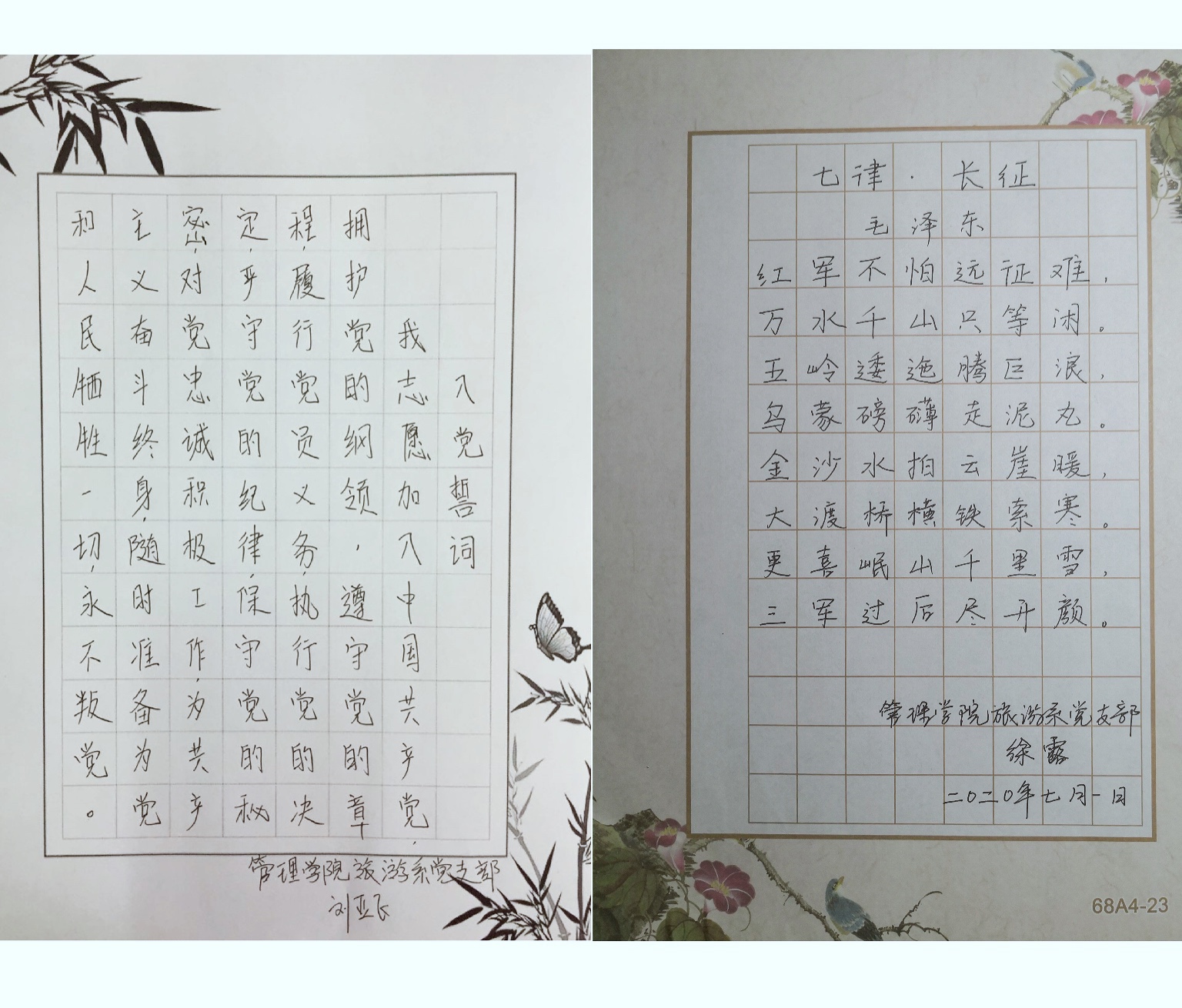 在中国共产党建党99周年之际,为继承和发扬党的光荣传统,热烈庆祝中国共产党的生日,再现党领导中国人民走过的辉煌历程,展示党领导革命建设和改革开放所取得的伟大成就,7月1日,beat365官网党总支旅游系党支部举办了庆祝建党99周年“书写红色经典,再现伟大历程”书法展示活动。