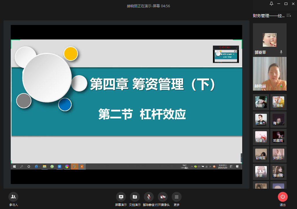 郭琰院长评价,开展网络示范课,既是对老师网上教学水平的检验,又是老师进行教学方法和教学手段创新的反映。首先,网上教学要采用创新的教学方法,调动学生学习的积极性,要结合不同专业的特点,创新教学方法。其次,教学平台要使用娴熟。任课教师利用相应教学平台,通过PPT、视频展示、签到、答题卡等形式开展教学。教学内容展示和学生互动相互补充。反映了老师对教学手段的掌握情况。第三,网上教学反映了老师良好的整体素质。四位任课教师教学态度认真,语言有一定亲和力、语速适当,内容讲解清晰、重点较突出;教学态度温和,有一定亲和力;语言表达清晰、语速适当,声音洪亮;内容讲授重点突出,层次较分明。