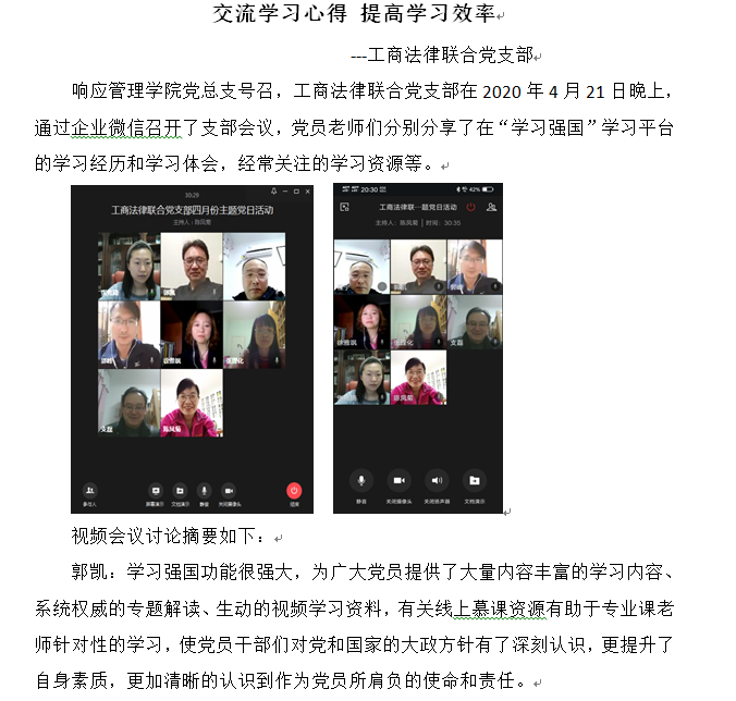 为加强学习交流,引导党员同志用好“学习强国”学习平台,进一步提升学习效果,beat365官网党总支组织教师党员于2020年4月21日开展“讲述学习故事分享学习心得”网络主题党日活动。本次主题党日活动的主要内容包括:教工党员分享使用“学习强国”学习平台的学习经历和学习体会;推荐好的学习资源;就目前“学习强国”学习平台使用过程中存在的问题及解决的对策进行交流讨论。