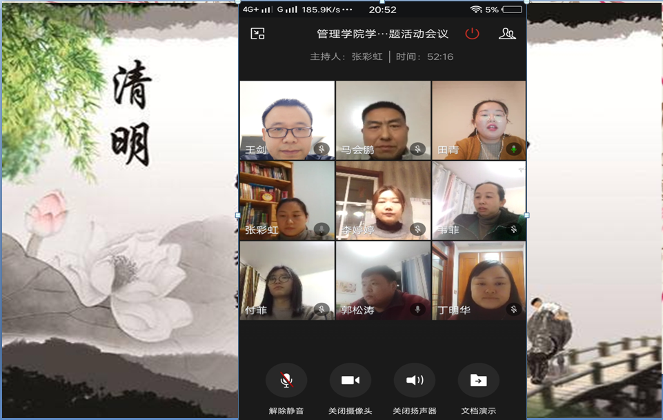会议之前,学生支部的党员教师们纷纷登录中华英烈网,网上献花祭奠英烈,表达心声。会议伊始,学生支部宣传委员丁明华同志对本次清明节主题活动流程及活动背景做了简要介绍,深切缅怀了先烈、英烈以及牺牲在抗击新冠肺炎疫情一线的英雄们,并对他们致以最崇高的敬意。同时也向各位党员发出倡议,倡议大家以此次疫情为契机,一起享受健康的生活方式。随后,支部各位党员教师将自己亲手摘录的关于清明的古诗词逐一在会议中分享、赏析,并结合自己在抗击新冠肺炎疫情工作中的所思所想探讨了对生命、健康的感悟,表达了对疫情期间冲在抗疫第一线的战士、党员的钦佩之情。