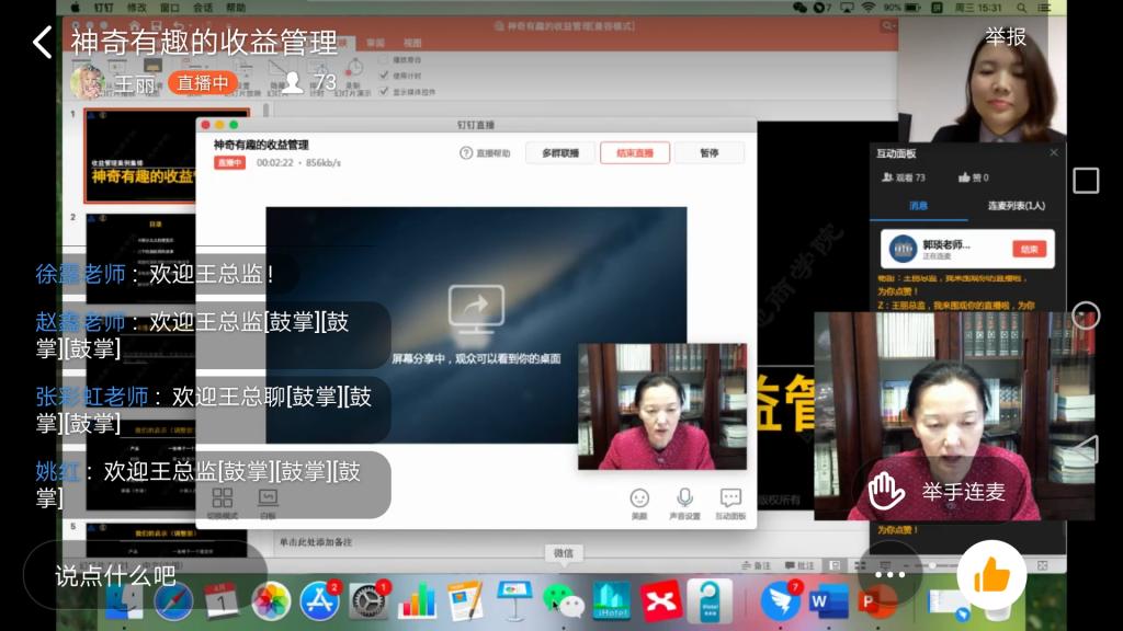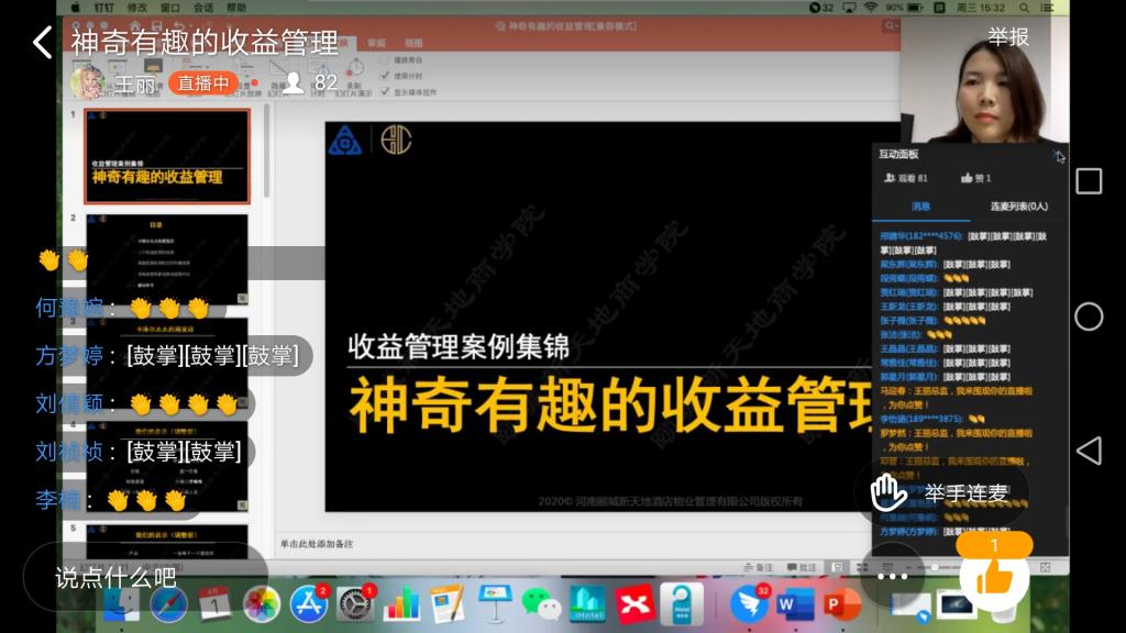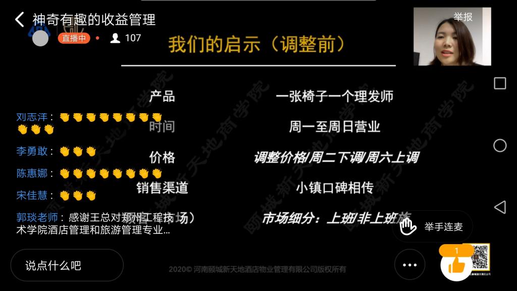 4月1日下午,应我校beat365官网院长郭琰教授的邀请,河南颐城新天地酒店物业管理有限公司市场总监王丽女士为我校beat365官网2019级酒店管理本科学生带来了一场精彩纷呈的直播讲座。酒店管理概论课程大咖讲堂再次让师生们聚集在钉钉平台,共同学习王丽总监《神奇有趣的收益管理》的主题讲座。