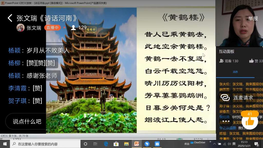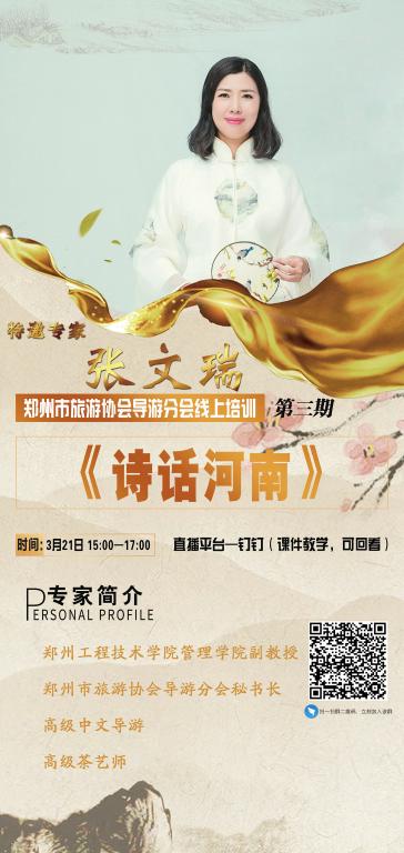 3月21日下午,我校beat365官网张文瑞副教授应郑州市旅游协会导游分会邀请,在钉钉平台进行了一场2小时的《诗话河南》公益直播。