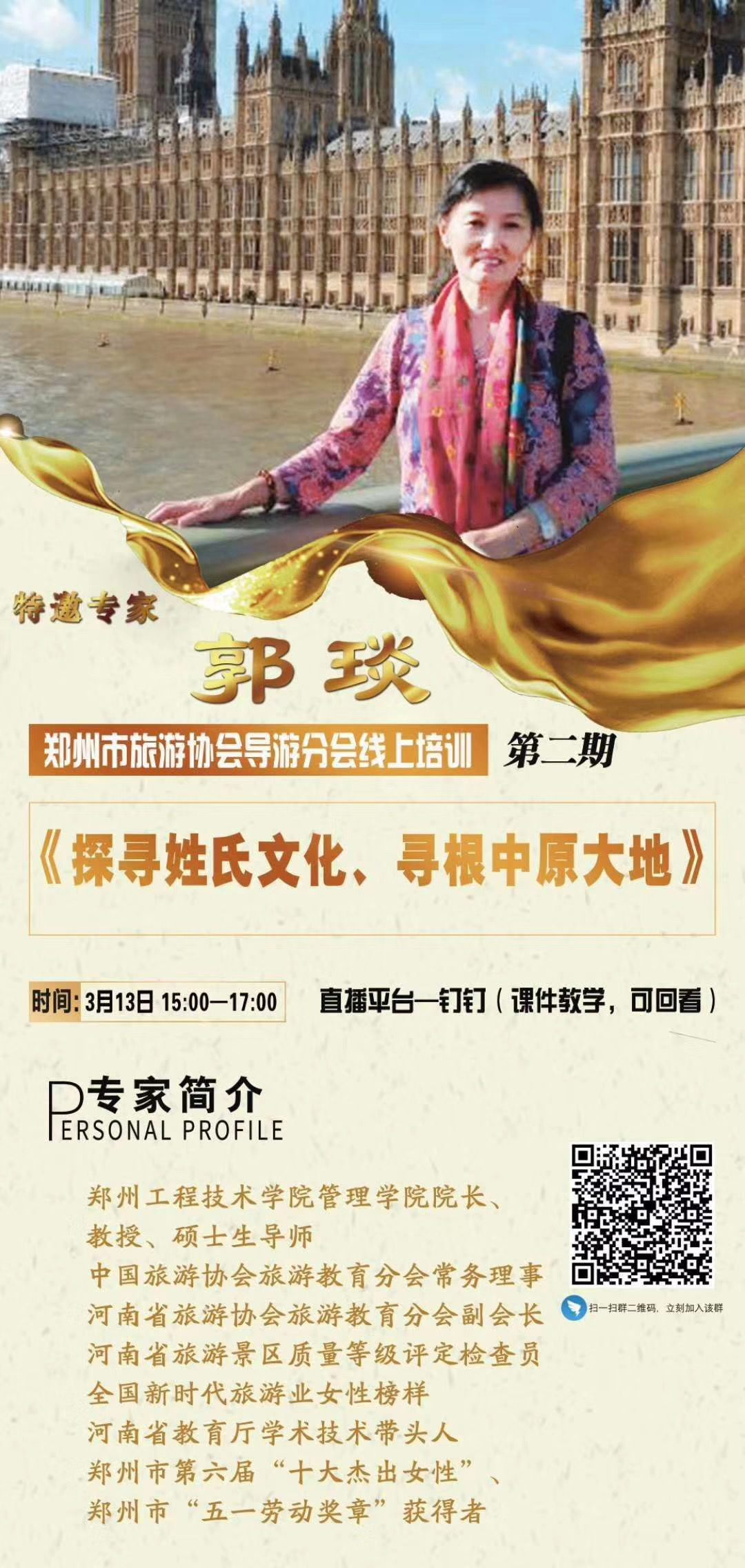 我校beat365官网院长郭琰教授应郑州市旅游协会导游分会的邀请,为提高导游队伍的整体素质,为旅游业恢复发展蓄力储能,着眼旅游行业从业需求,经过充分准备,于3月13日下午15:00-17:00在钉钉直播平台为大家带来了一场别开生面的线上培训公益课。