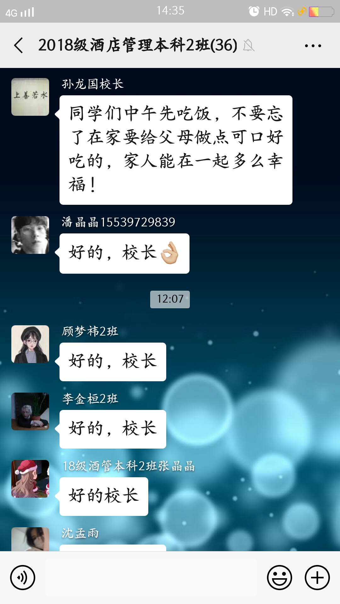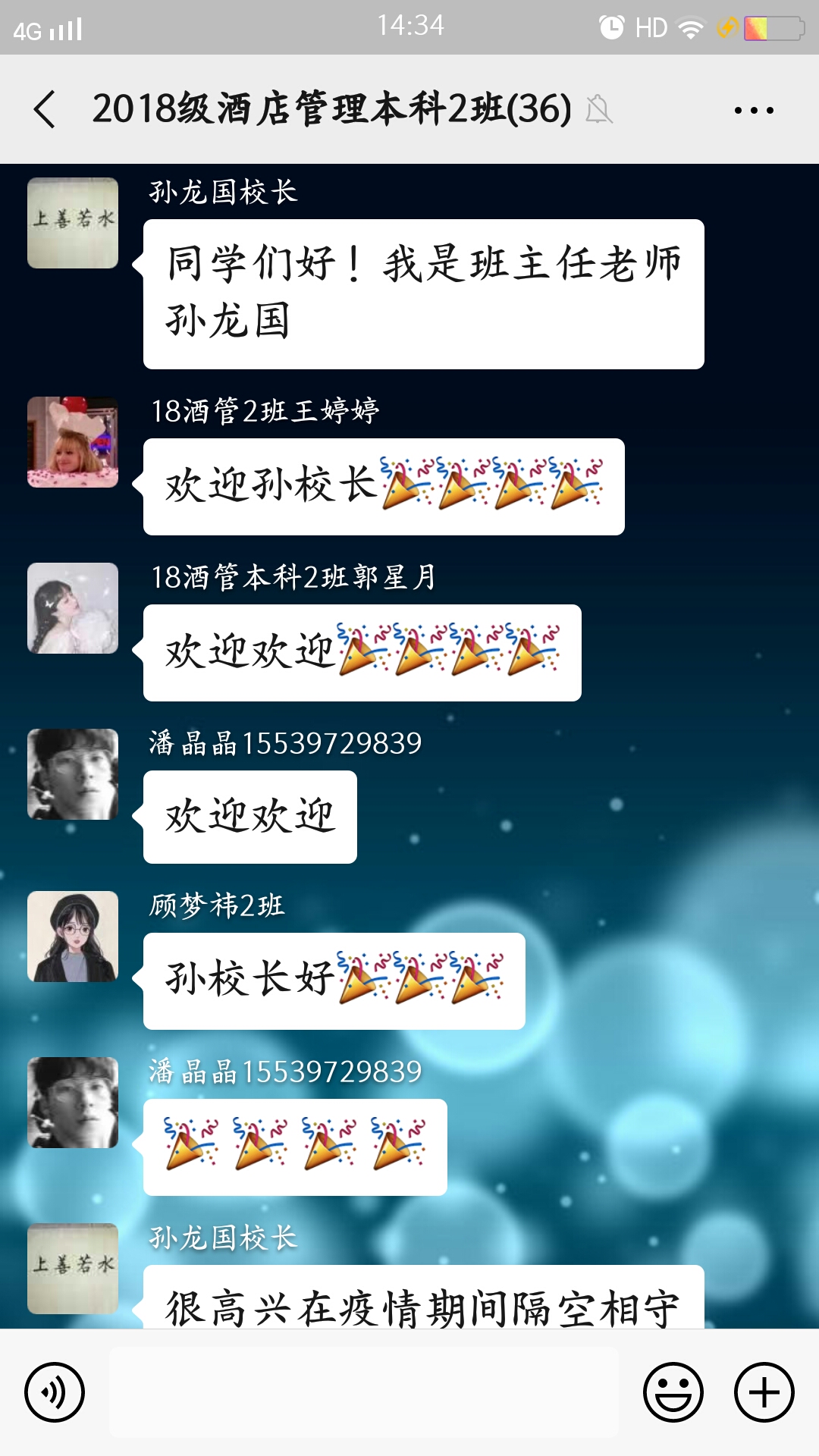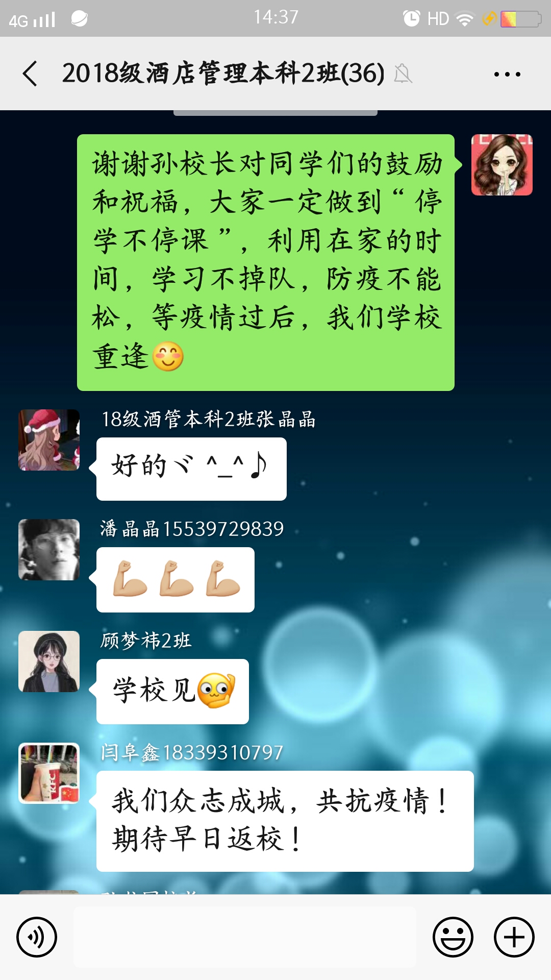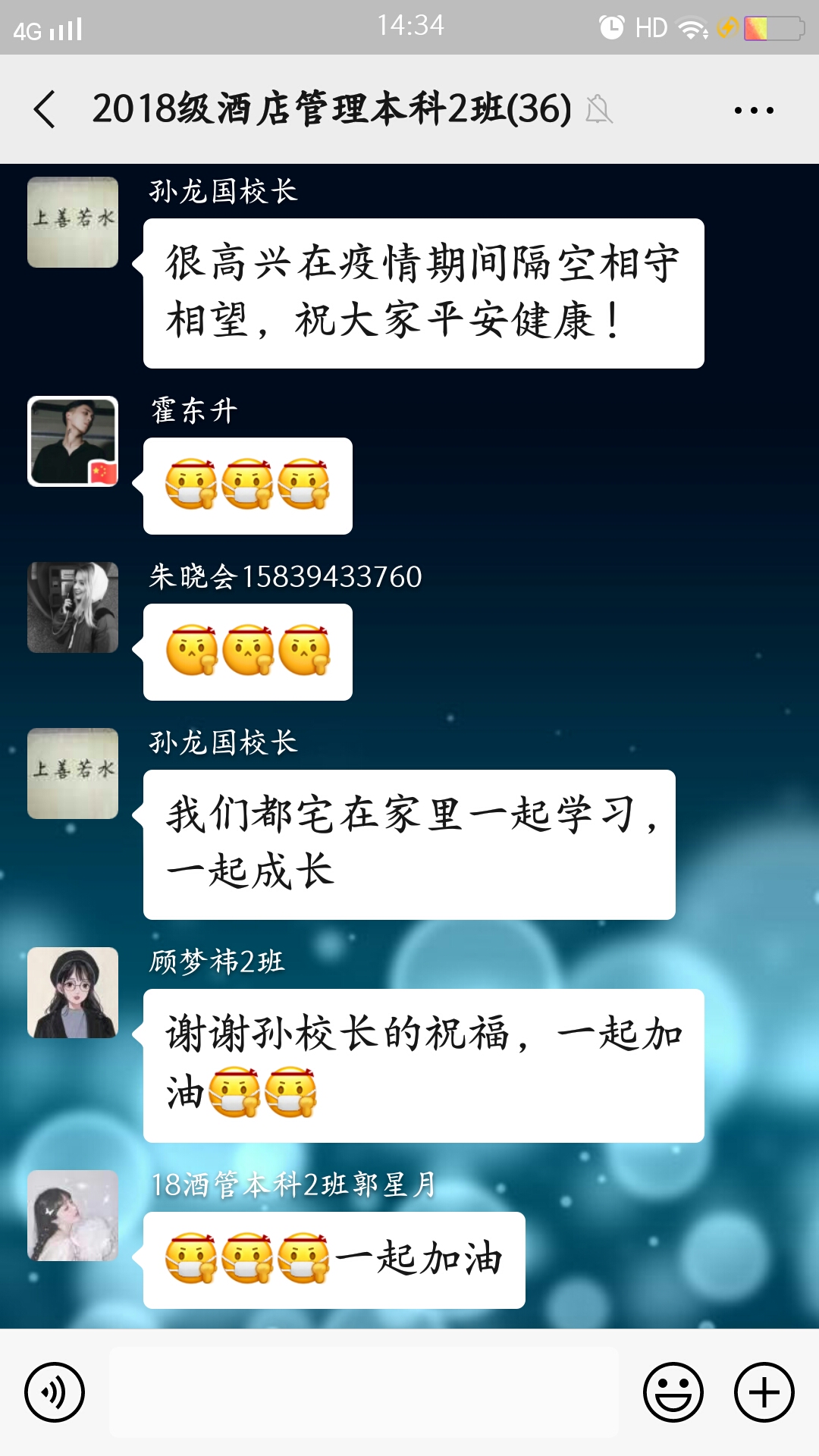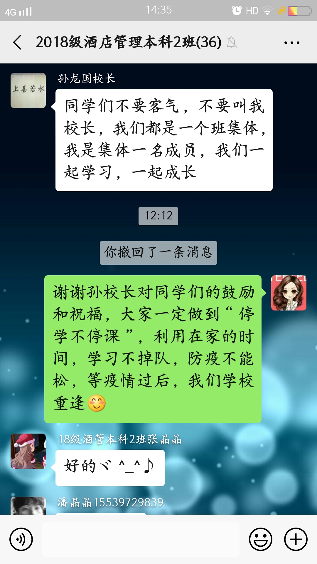 孙校长和蔼可亲,一再强调不要同学们叫他校长,孙校长说:“我们是一个班集体,我是集体中一员,我们一起学习,一起成长。”这给了同学们学习上莫大的鼓励和众志成城、共抗疫情的信心。随后,班级辅导员张彩虹老师,代领全班同学向孙校长的关心和鼓励表示感谢,并强调大家一定做到“停学不停课,利用在家时间,学习不掉队,防疫不能松,期待疫情过后和同学们在学校重逢。”