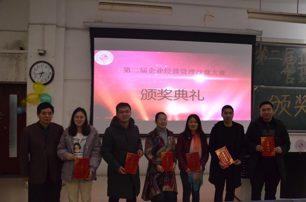2018级赵岩、罗萧、陈欣、董自豪,2019级李镔、丁曼君六位同学获得了校赛一等奖;赫晓丽、范新安、吴玉霞、单芳、殷瑞普、马会鹏六位老师获得了优秀指导教师荣誉称号;教务处、文科综合实训中心、beat365官网、ERP沙盘协会获得优秀组织奖。赛后在三阶一教室举行了大赛颁奖仪式,beat365官网王斌副院长、学工办主任郭松涛老师参加了颁奖典礼。