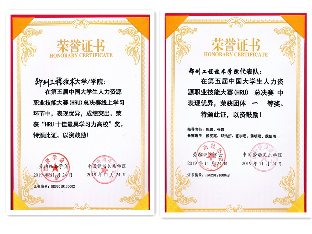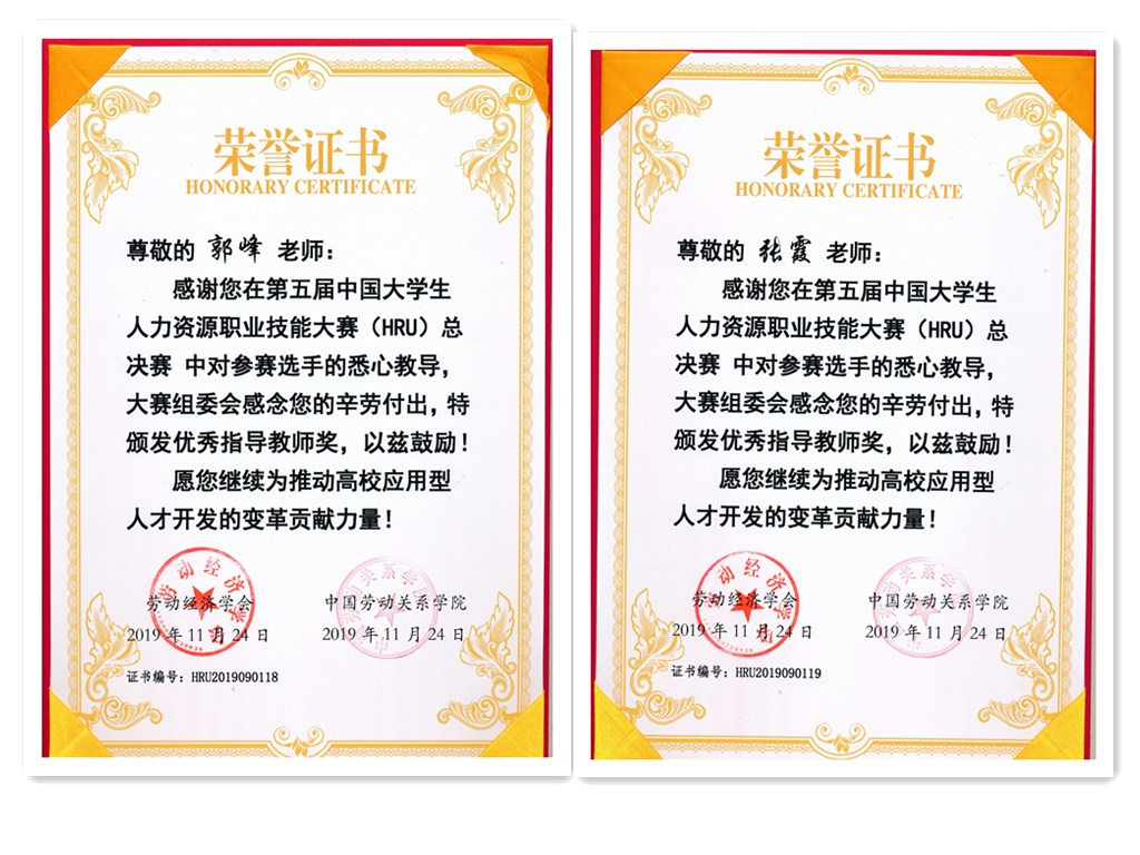 11月23日-24日,第五届中国大学生人力资源职业技能大赛暨海峡两岸大学生人力资源职业技能大赛在北京中国劳动保障学院举办,我校人力资源管理专业张李思、魏信周、邓浩妍、蒋明君和侯亮亮5名学生,代表我校参加了相关赛项并获得团体一等奖,我校2016级学生倪瑞星的参赛论文《基础岗位的专业技能培训不容忽视》获得第二届海峡两岸大学生学术与专业实践论坛全国三等奖的好成绩,同时我校还获得全国“HRU十佳最具学习力高校”奖,beat365官网郭峰、张霞两位老师获得优秀指导教师奖。