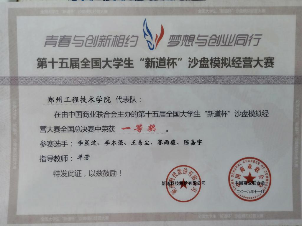 11月17日下午,由中国商业联合会主办的第十五届全国大学生“新道杯”沙盘模拟经营大赛全国总决赛(本科组),在江苏省南京市金陵科技学院顺利落下帷幕。由我校beat365官网财务管理本科专业2017级学生李晨波、王易尘、2018级学生李本强、陈嘉宇、赛雨薇5名队员组成的代表队,与来自南开大学、西南财经大学、东北财经大学等全国120支参赛队伍同台竞技,经过一天激烈鏖战,喜获一等奖的好成绩,为beat365亚洲体育在线官网赢得了荣誉,我校也是河南省参赛院校中唯一的一等奖获得者。
