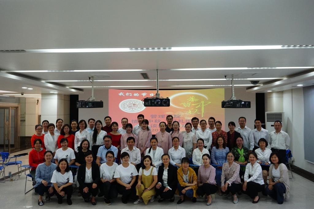 诵读活动精心挑选了与中秋有关的名篇佳作,紧紧围绕中华民族伟大复兴的中国梦等题材,让老师们在经典诵读活动中感受中华民族传统节日——“中秋”的文化内涵,感受传统文化带给大家的魅力,增强文化自信;歌颂伟大祖国的繁荣昌盛,引导老师们更加热爱中华民族,热爱我们今天的幸福生活,增强民族自信。活动在表现“同心邀明月,千里共婵娟”的《水调歌头》歌舞中拉开序幕。学院学工办的老师诵读了北宋大文豪苏轼的这首千古绝唱,再加上悠扬的旋律,学工办老师们用翩翩的舞姿、动听的歌声,倾诉着世间的柔情与离恨。会计教研室老师献上3个节目:《祖国万岁》句句铿锵,犹如编钟响彻天宇,每一个音符都是惊心动魄的春雷,让人满眼都是如雨的泪水;《我的祖国》歌颂了祖国的高山巍峨,地大物博,大河奔腾,风光秀美,表达了对祖国深深的爱恋;《诗意中国》告诉我们,从回眸的一个一个眼神里,从读到的优雅气质里,中国的诗意无处不在。旅游管理教研室老师为大家带来3个节目:《我为祖国种下一棵树》,种在游子乡愁归处,种在绿水青山深处,偎依在祖国怀抱;《我的祖先名叫炎黄》提醒每位中国人都不能忘记自己身为炎黄子孙,追忆祖先的光辉历史,知道自己从何处来,要往何处去;出生在黄河之滨,拥有黄皮肤,我们是龙的传人,我们《为祖国放歌》。法律教研室老师带来的是一首经典古诗《春江花月夜》配乐朗诵,意境深远,优美动听。可谓“悠悠古筝曲,浓浓翰墨香,暖暖春江水,深深游子情。”公共管理教研室老师身着统一带有“中国”字样的白T恤,齐声朗诵《念奴娇•中秋》一词,描写了登高望远时幻想中月宫美妙的景象,抒发徘徊月下时乘长风幡然归去的愿望。最后的压轴节目是学工办铁赫老师的个人秀,只见他身着浅蓝长衫,手持一把折扇,气定神闲,抑扬顿挫地吟诵起了《滕王阁序》(节选),引发大家掌声如潮。
