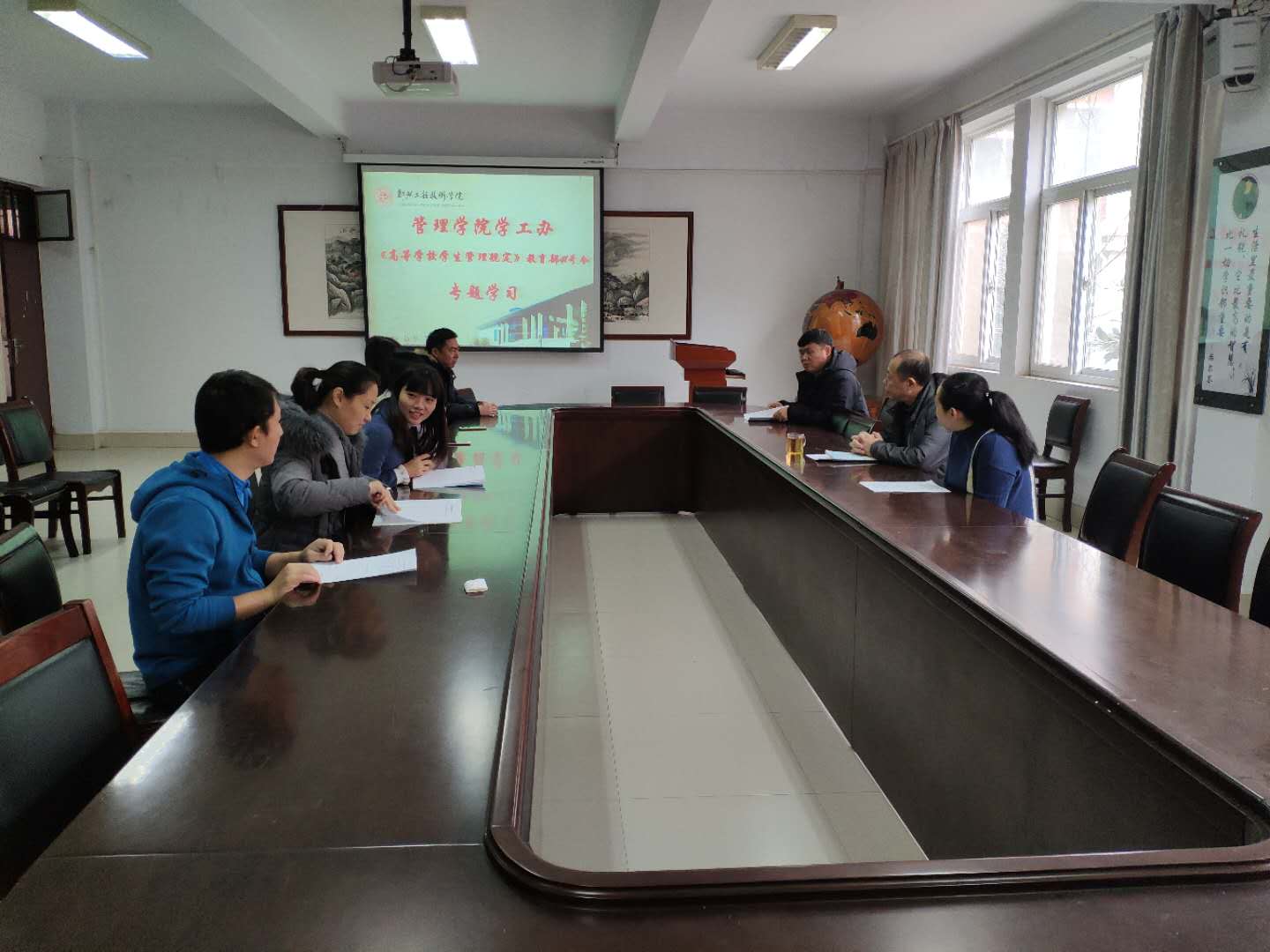 12月24日上午,beat365官网学工办组织辅导员,在3108会议室学习教育部第41号令,并结合《beat365亚洲体育在线官网学生手册》进行了详细解读,全体辅导员参加了学习,会议由学工办主任郭松涛主持。