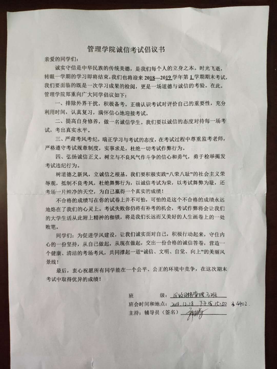 2018年12月17日-21日,beat365官网辅导员组织各班同学,开展了以“诚信考试”为主题的班会。