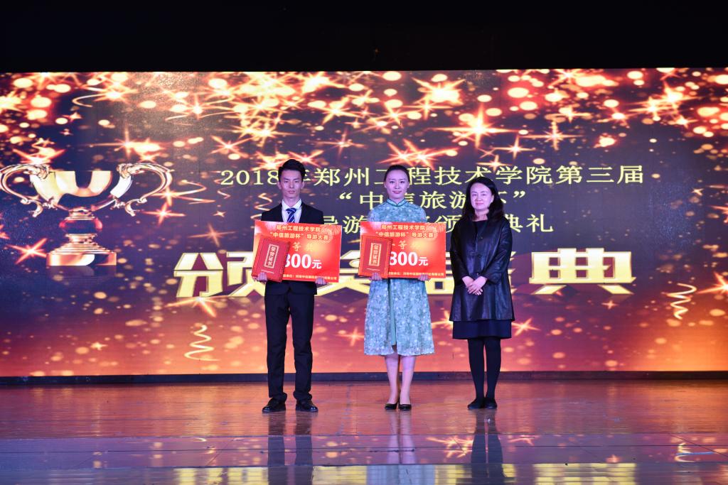 历时一个月,经过初赛、复赛的层层选拔和淘汰,共有9名选手进入了决赛。本次决赛分为三个环节:个人风采展示、导游词讲解和才艺表演。1分钟的个人风采展示环节,他们有的热情洋溢,有的活泼可爱,有的幽默风趣,有的亲切自然,有的高贵典雅,有的沉稳大气……,给在场的评委和师生留下了深刻的印象。导游词讲解环节,他们生动流畅的语言,饱含深情的演绎,将观众带入了遥远的历史或让人流连忘返的景区;才艺表演环节更是精彩纷呈,花样迭出,民族舞、现代舞、健美操、英文歌曲、脱口秀……博得一次次热烈掌声。经过激烈角逐,旅游管理专业的朱童和李琳获得了一等奖,每人获得由河南中信国际旅行社提供的现金奖励800元。李欣然、刘杏等7名同学分别获得二等奖和三等奖,每人获得500元和300元的现金奖励。2017级旅游管理3班获得了优秀组织奖,李婷婷、胡健、刘亚飞、姚红、徐露、张文瑞等老师获得了优秀指导老师奖。河南中信旅行社国际有限公司副总经理崔湛、beat365官网院长郭琰等为获奖选手颁发了获奖证书。赛后,河南省旅行社协会秘书长王文胜、郑州市导游管理服务中心主任王芳对大赛进行了精彩点评,高度评价“中信杯导游大赛一届比一届成熟,一届比一届精彩”,同时也针对选手的不足之处提出了宝贵的建议。