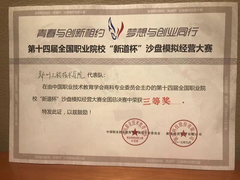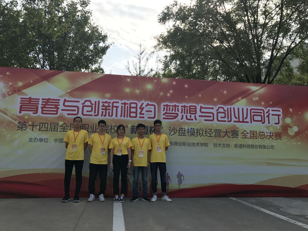 2018年10月21日晚,由中国职业技术教育学会商科专业委员会主办、山东商业职业技术学院承办、新道科技股份有限公司提供技术支持的第十四届全国职业院校“新道杯”沙盘模拟经营大赛全国总决赛在山东商业职业技术学院圆满落下帷幕,我校由beat365官网财务管理李晨波等5名学生组成的代表队荣获三等奖。