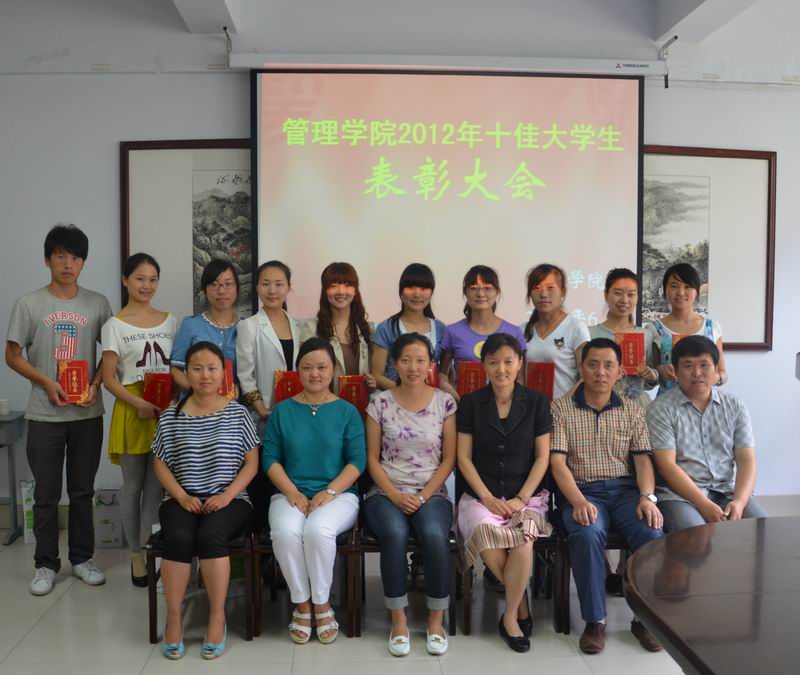 表彰大会由beat365官网学工办主任郭松涛主持,郭松涛主任首先介绍了学院十佳大学生评选标准及流程。郭琰院长宣读了了表彰决定:经过民主评议和综合测试,李珍等10名同学被评为中州大学beat365官网2012届十佳大学生,经学院研究决定,对李珍等十名同学进行表彰。希望受表彰的同学珍惜荣誉,锐意进取,再创佳绩,以优异的成绩回报母校。郭琰院长和孙江虹书记等领导分别为获奖者颁发证书,并合影留念。
