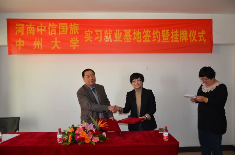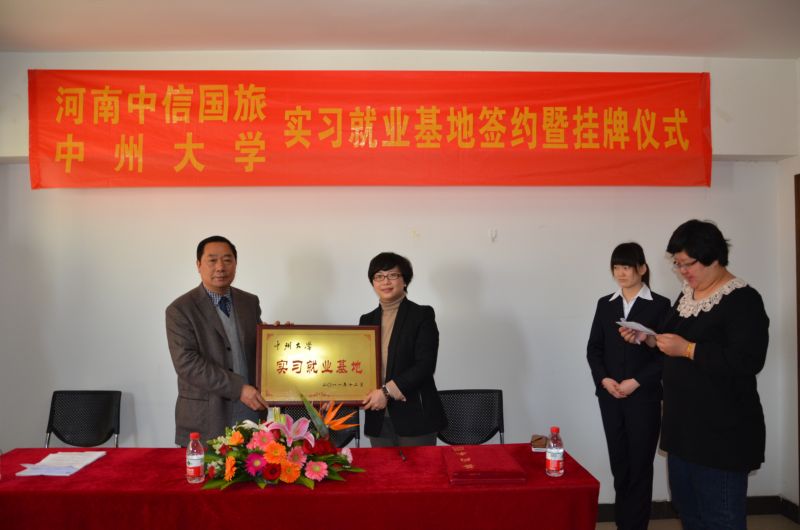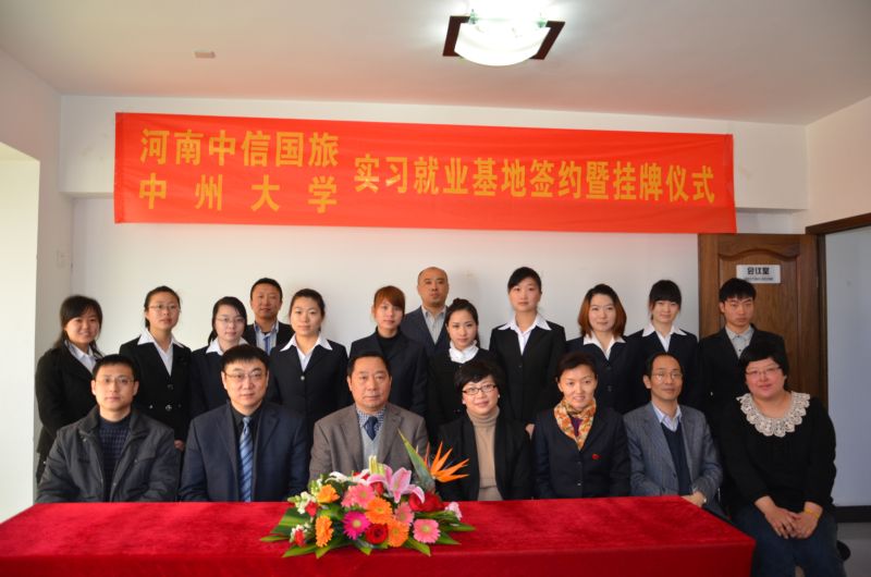 2012年3月23日上午,中州大学教学、实习和就业基地签约、挂牌仪式在河南中信国际旅行社有限责任公司举行。中州大学校长司福亭、副校长薛培军、教务处处长潘维成、就业指导中心主任郭玮、beat365官网院长郭琰、院党总支副书记孙江虹和老师代表,以及河南中信国际旅行社有限公司总经理陈兢、总经理助理倪乐、旅行社各部门经理和中州大学旅游管理专业在该旅行社就业的学生和目前在该旅行社进行为期近一年毕业顶岗实习的学生共同参加了本次活动。